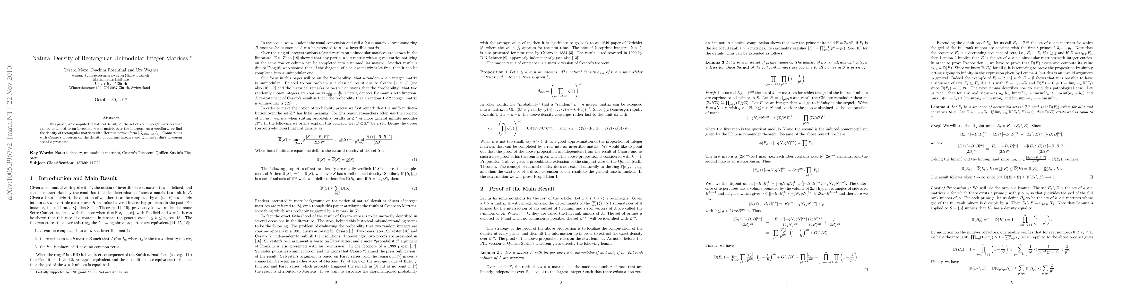 This paper calculates the natural density of k x n integer matrices that can be extended to invertible n x n matrices, revealing the density of rectangular matrices with Hermite normal form [O Id]. It also draws connections to Cesaro's Theorem and Quillen-Suslin's Theorem.