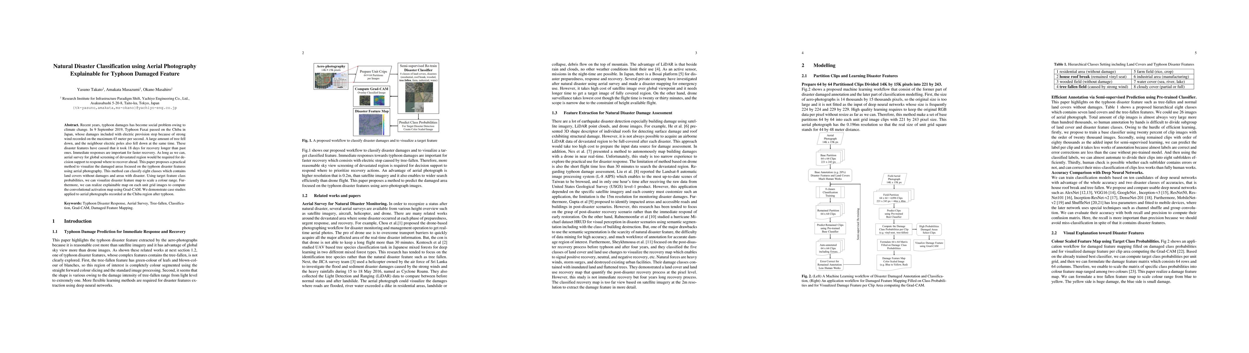 This paper proposes a method to classify and visualize typhoon damage using aerial photography, focusing on specific disaster features. The approach classifies eight land cover classes, including undamaged and damaged areas, and uses Grad-CAM to create explainable maps for decision support in recovery efforts.