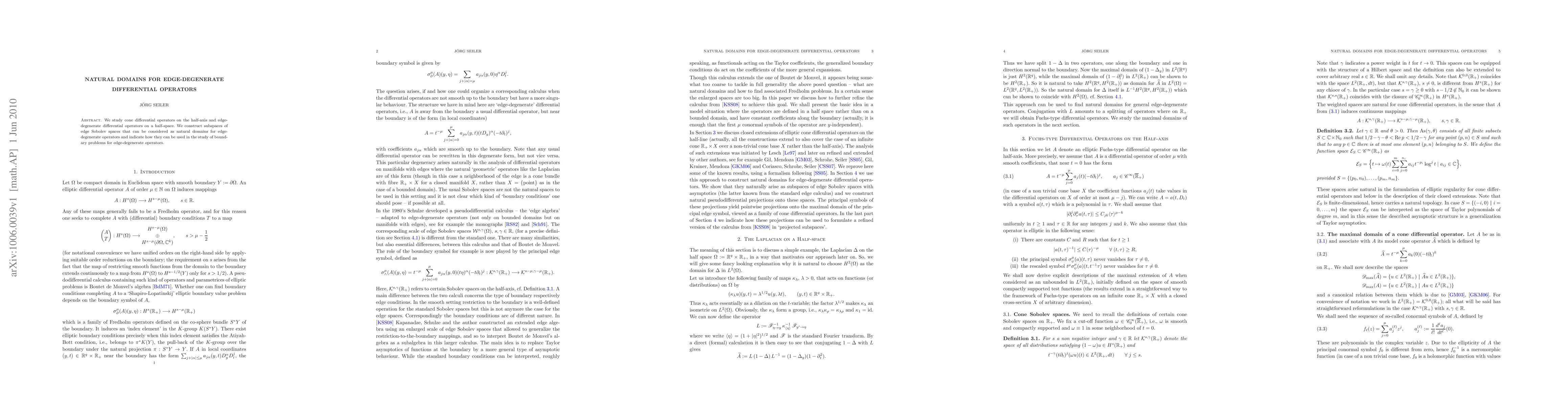 This paper constructs natural domains for edge-degenerate differential operators on half-spaces by identifying subspaces within edge Sobolev spaces, facilitating the study of boundary problems associated with these operators. The methodology provides a structured approach to analyzing differential operators in constrained geometric settings.