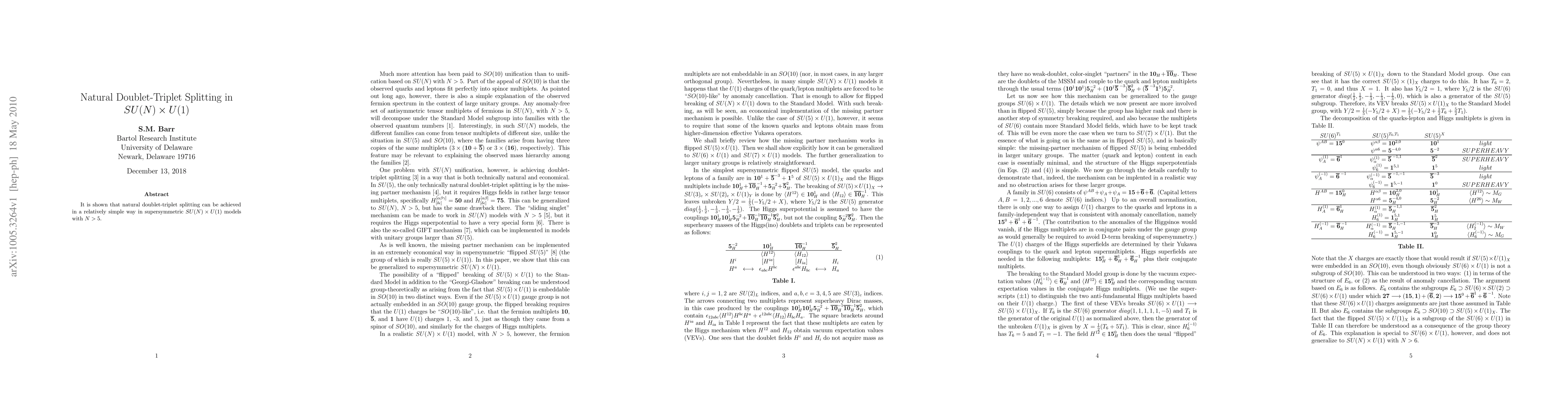 Summary: This paper demonstrates that supersymmetric SU(N)×U(1) models with N>5 can naturally achieve doublet-triplet splitting, providing a straightforward solution in these frameworks.