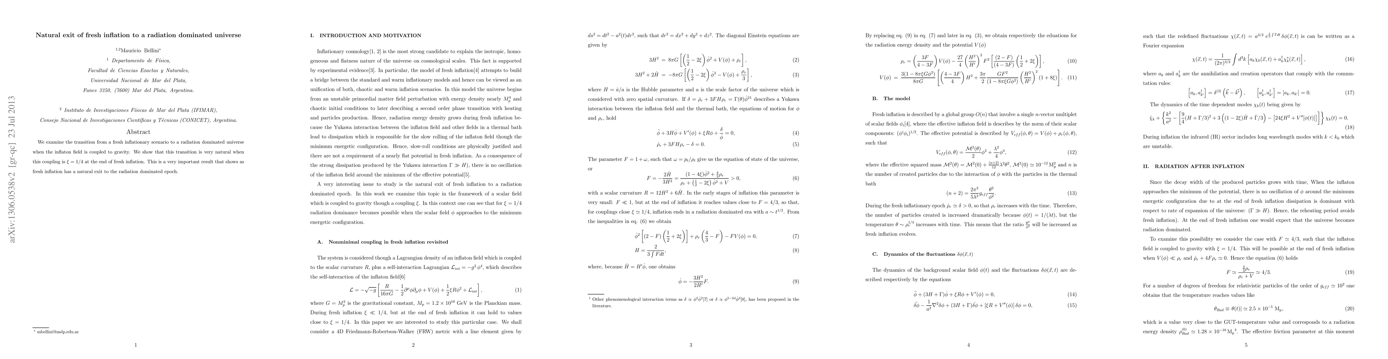 The research examines the transition from fresh inflation to a radiation-dominated universe, focusing on the inflaton field's coupling to gravity, specifically when the coupling constant ξ equals 1/4 at the end of fresh inflation.