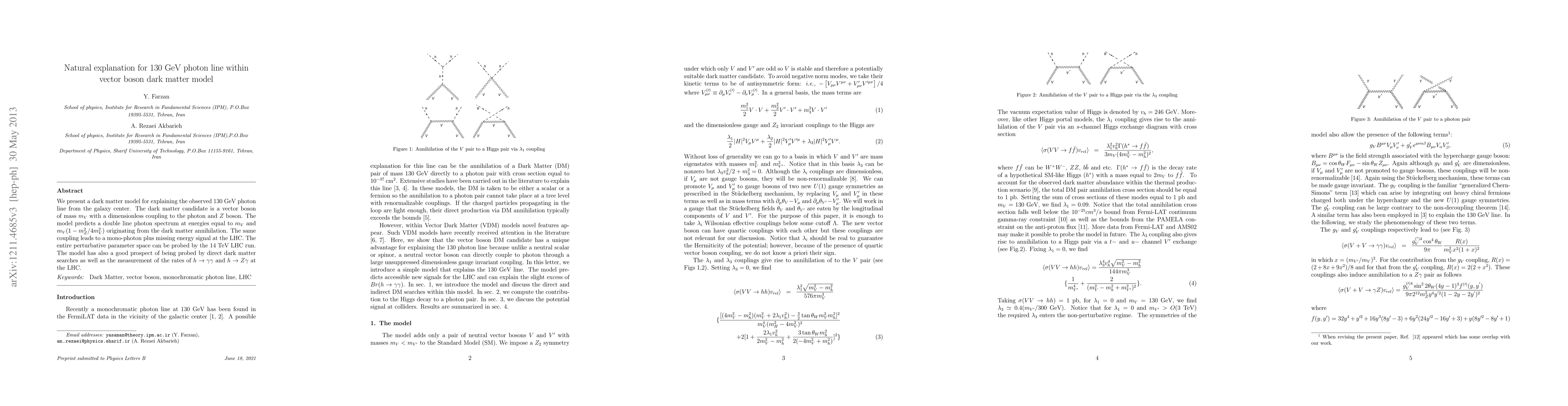 This paper proposes a vector boson dark matter model to explain the observed 130 GeV photon line from the galaxy center. The model predicts a double photon spectrum and a mono-photon signal at the LHC, with the entire parameter space potentially probed by the 14 TeV LHC and direct dark matter searches.