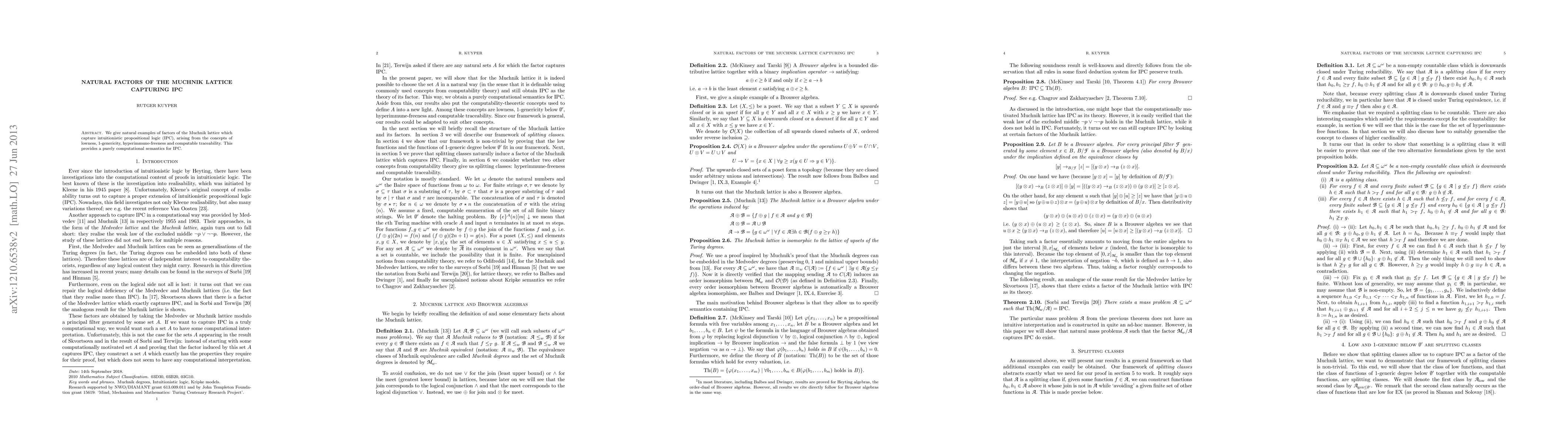 The paper presents natural factors of the Muchnik lattice that capture intuitionistic propositional logic (IPC) through concepts like lowness, 1-genericity, hyperimmune-freeness, and computable traceability, offering a computational semantics for IPC.