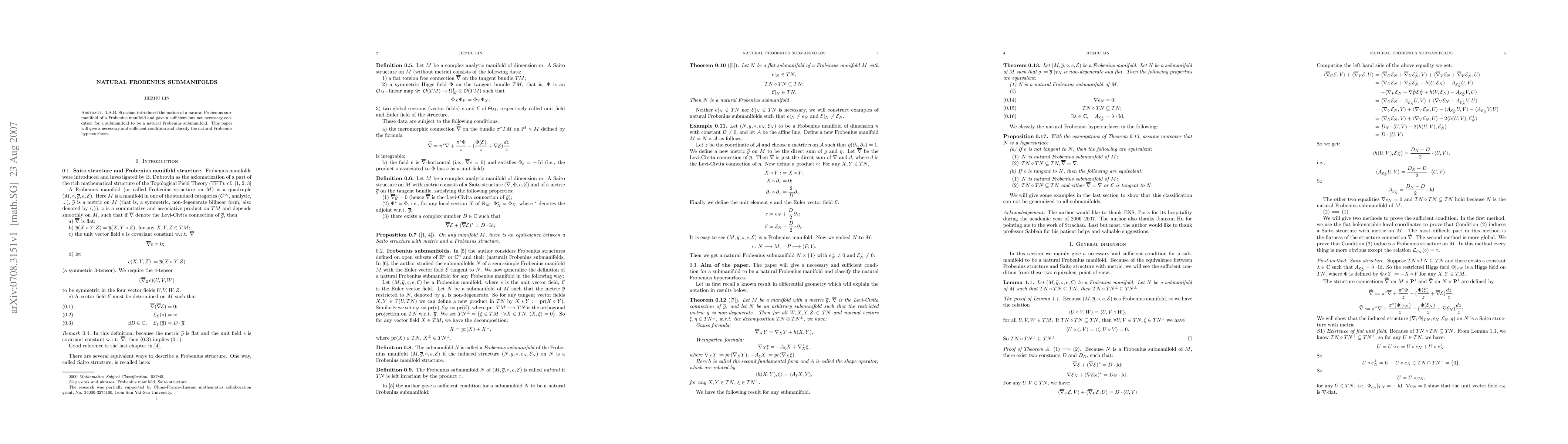 This paper refines the definition of natural Frobenius submanifolds by providing a necessary and sufficient condition, and it classifies natural Frobenius hypersurfaces within the broader context of Frobenius manifolds.
