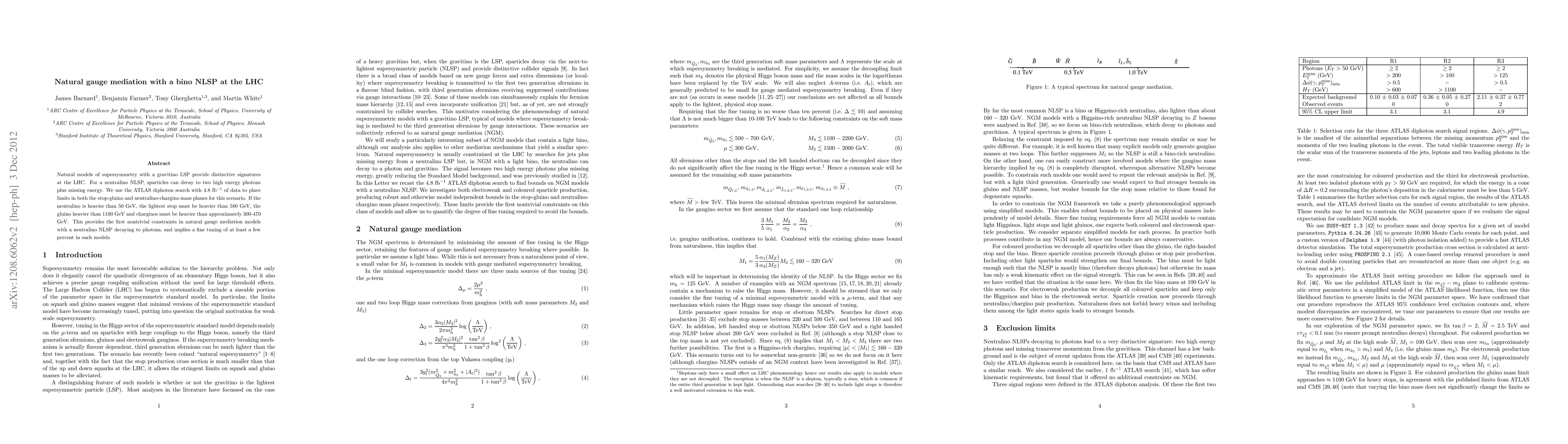 This paper investigates natural gauge mediation models with a bino neutralino as the next-to-lightest supersymmetric particle (NLSP) at the LHC, using ATLAS diphoton search data. It sets constraints on stop-gluino and neutralino-chargino masses, finding that the lightest stop must exceed 580 GeV, the gluino over 1100 GeV, and charginos around 300-470 GeV if the neutralino is heavier than 50 GeV, indicating significant fine-tuning in these models.