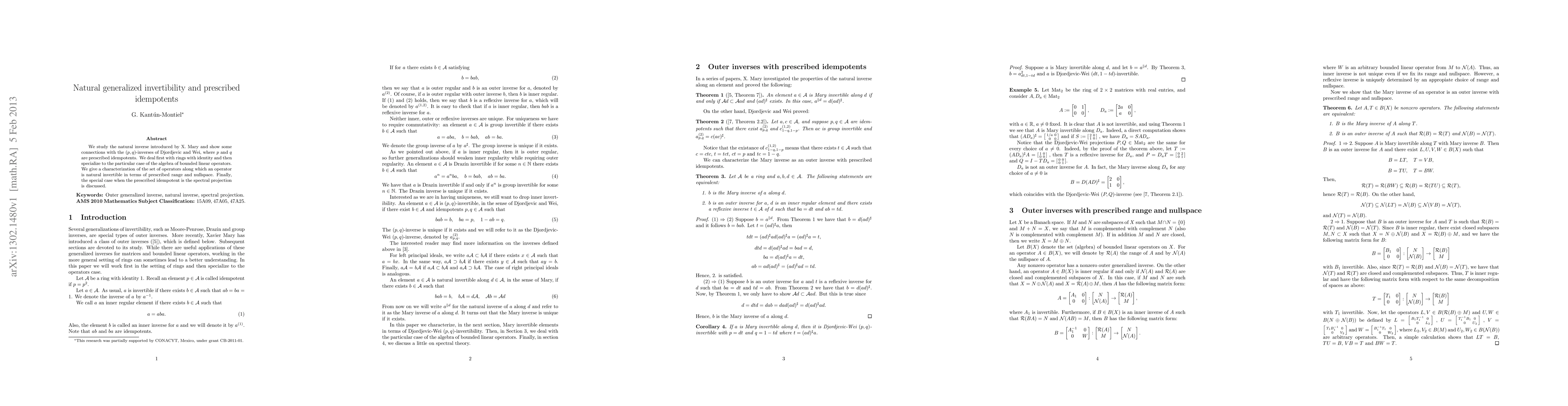 We study the natural inverse introduced by X. Mary and show some connections with the $(p,q)$-inverses of Djordjevic and Wei, where $p$ and $q$ are prescribed idempotents. We deal first with rings with identity and then specialize to the particular case of the algebra of bounded linear operators. We give a characterization of the set of operators along which an operator is natural invertible in terms of prescribed range and nullspace. Finally, the special case when the prescribed idempotent is the spectral projection is discussed.