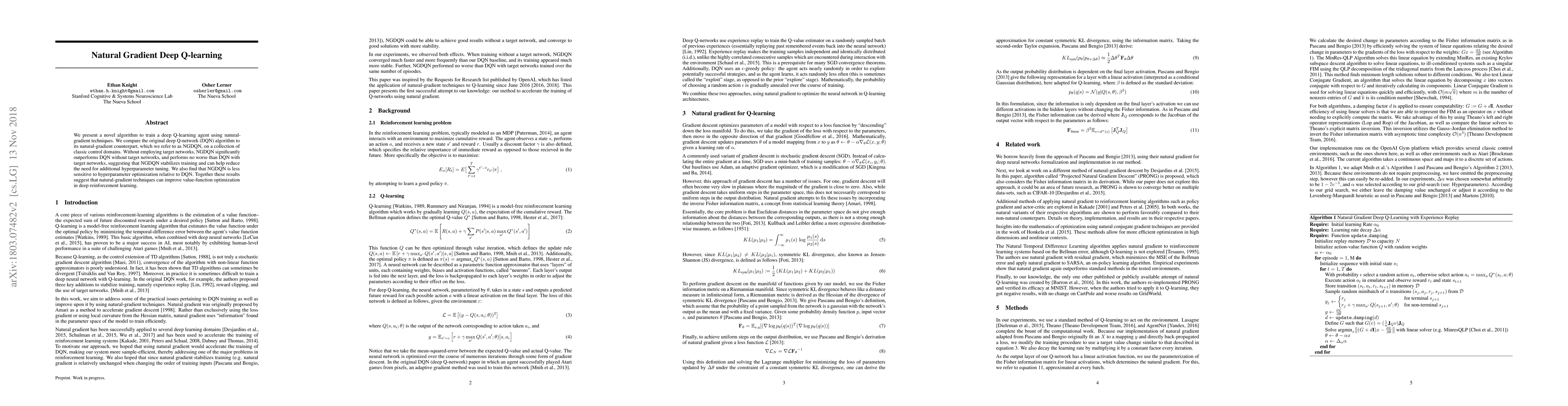 The paper introduces NGDQN, a natural-gradient deep Q-learning algorithm, which outperforms standard DQN without target networks and matches DQN's performance with target networks, indicating enhanced training stability and reduced sensitivity to hyperparameters.