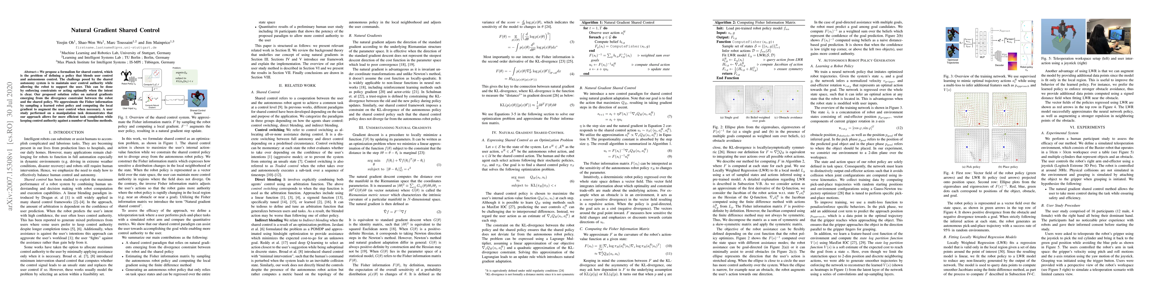 This paper introduces a formalism for shared control that blends user and autonomous control using natural gradients. The approach maintains user authority while enabling the robot to assist, demonstrated through a user study showing improved task efficiency compared to baseline methods.