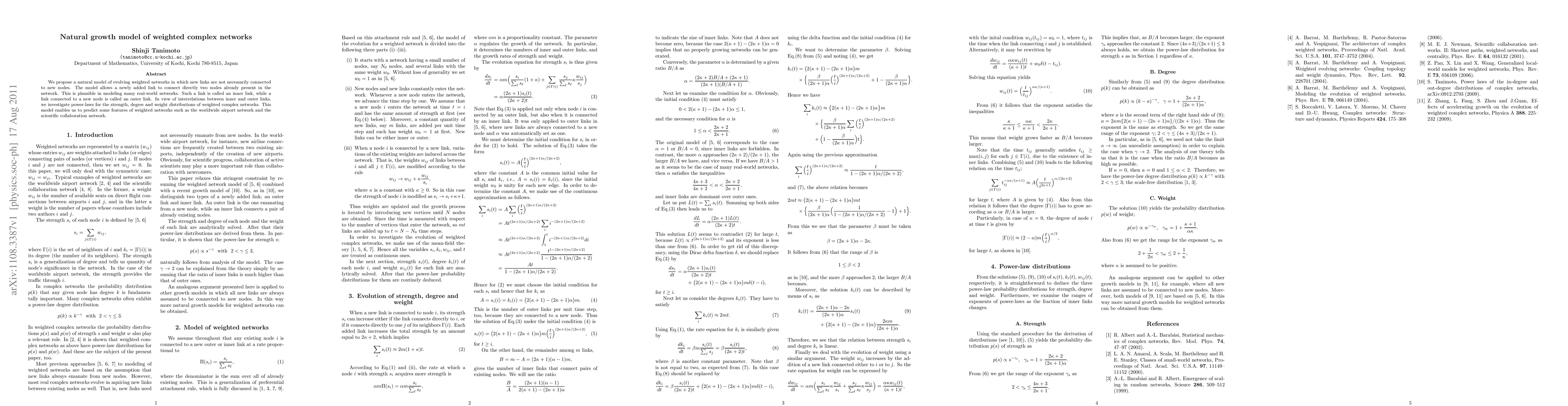 We propose a natural model of evolving weighted networks in which new links are not necessarily connected to new nodes. The model allows a newly added link to connect directly two nodes already present in the network. This is plausible in modeling many real-world networks. Such a link is called an inner link, while a link connected to a new node is called an outer link. In view of interrelations between inner and outer links, we investigate power-laws for the strength, degree and weight distributions of weighted complex networks. This model enables us to predict some features of weighted networks such as the worldwide airport network and the scientific collaboration network.