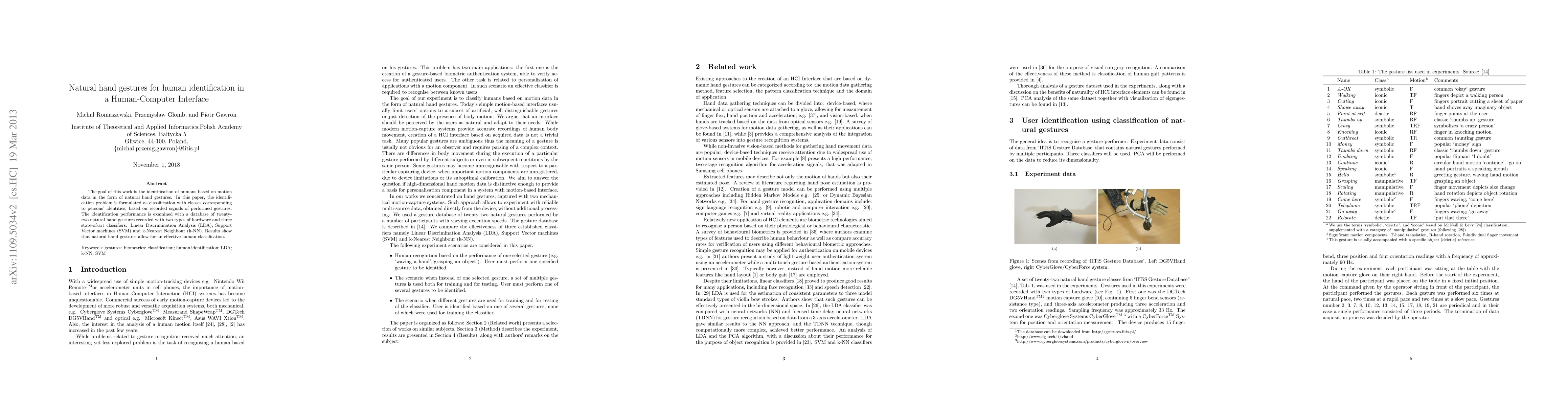 The goal of this work is the identification of humans based on motion data in the form of natural hand gestures. In this paper, the identification problem is formulated as classification with classes corresponding to persons' identities, based on recorded signals of performed gestures. The identification performance is examined with a database of twenty-two natural hand gestures recorded with two types of hardware and three state-of-art classifiers: Linear Discrimination Analysis (LDA), Support Vector machines (SVM) and k-Nearest Neighbour (k-NN). Results show that natural hand gestures allow for an effective human classification.