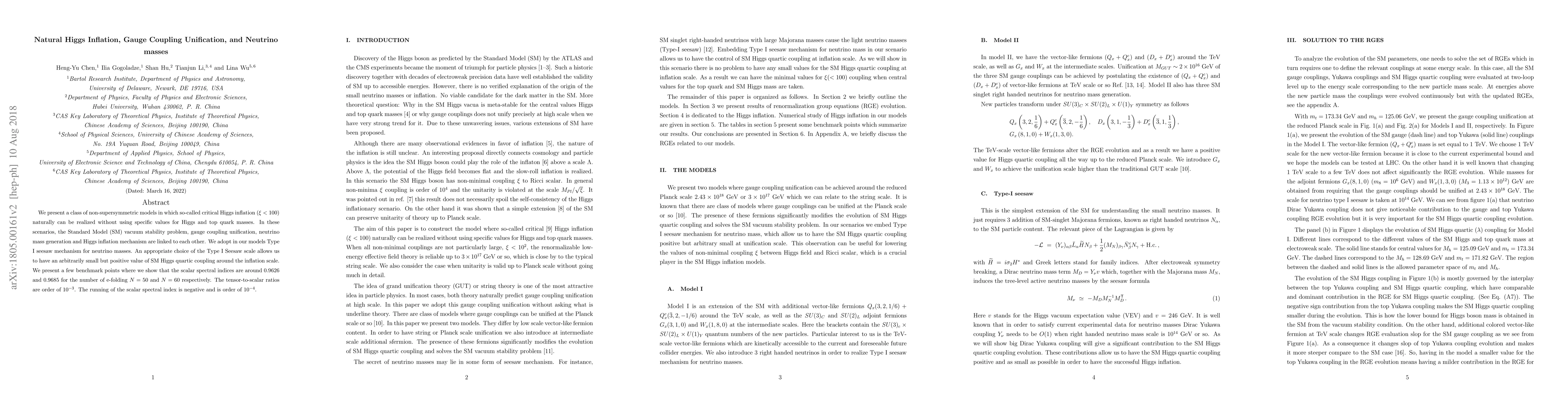 This paper proposes non-supersymmetric models for natural Higgs inflation, linking gauge coupling unification, neutrino mass generation via Type I seesaw, and the Standard Model vacuum stability. Benchmark points show scalar spectral indices around 0.9626-0.9685 and tensor-to-scalar ratios of order $10^{-3}$.