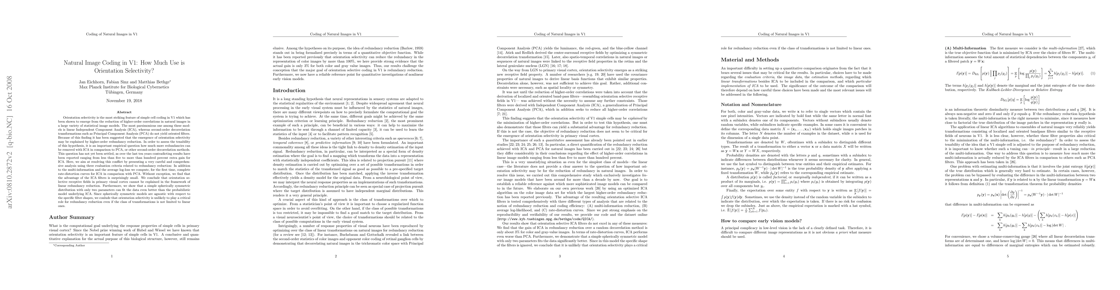 Orientation selectivity is the most striking feature of simple cell coding in V1 which has been shown to emerge from the reduction of higher-order correlations in natural images in a large variety of statistical image models. The most parsimonious one among these models is linear Independent Component Analysis (ICA), whereas second-order decorrelation transformations such as Principal Component Analysis (PCA) do not yield oriented filters. Because of this finding it has been suggested that the emergence of orientation selectivity may be explained by higher-order redundancy reduction. In order to assess the tenability of this hypothesis, it is an important empirical question how much more redundancies can be removed with ICA in comparison to PCA, or other second-order decorrelation methods. This question has not yet been settled, as over the last ten years contradicting results have been reported ranging from less than five to more than hundred percent extra gain for ICA. Here, we aim at resolving this conflict by presenting a very careful and comprehensive analysis using three evaluation criteria related to redundancy reduction: In addition to the multi-information and the average log-loss we compute, for the first time, complete rate-distortion curves for ICA in comparison with PCA. Without exception, we find that the advantage of the ICA filters is surprisingly small. Furthermore, we show that a simple spherically symmetric distribution with only two parameters can fit the data even better than the probabilistic model underlying ICA. Since spherically symmetric models are agnostic with respect to the specific filter shapes, we conlude that orientation selectivity is unlikely to play a critical role for redundancy reduction.