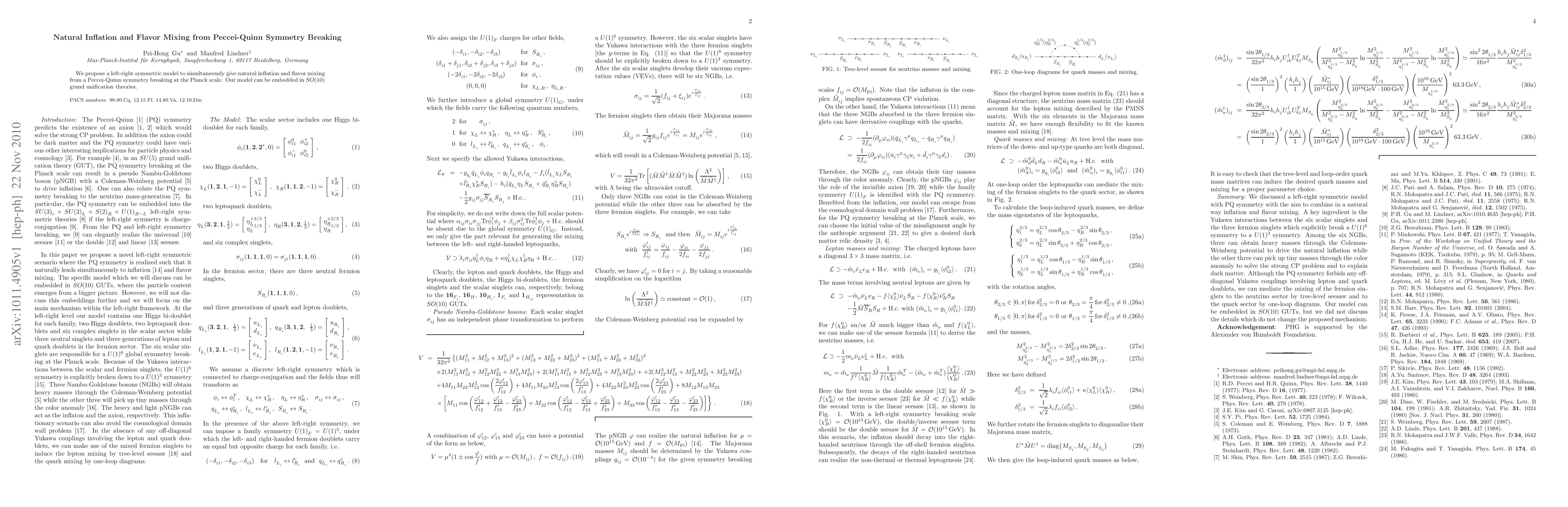 Summary: This paper proposes a left-right symmetric model to achieve natural inflation and explain flavor mixing through Peccei-Quinn symmetry breaking at the Planck scale, which can be incorporated within SO(10) grand unification theories.