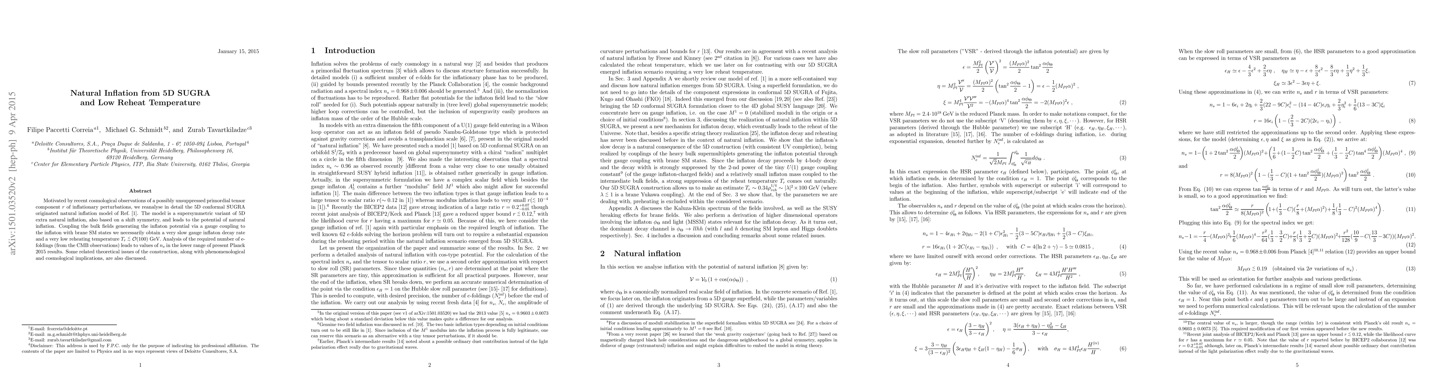 This paper explores a 5D supersymmetric conformal SUGRA model of natural inflation, which predicts a low reheating temperature of around O(100) GeV and aligns with recent cosmological observations of a potentially unsuppressed tensor component in inflationary perturbations. The model's implications for the spectral index $n_s$ are also discussed.