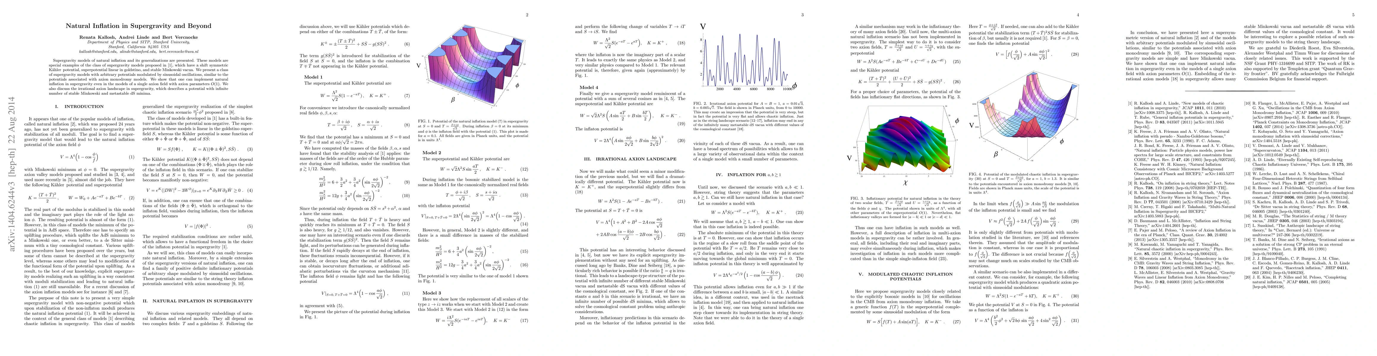This paper explores supergravity models of natural inflation featuring shift-symmetric Kähler potentials, linear superpotentials in goldstino, and stable Minkowski vacua. It introduces a class of models with sinusoidally modulated potentials akin to axion monodromy, demonstrating natural inflation in single axion field scenarios with parameters O(1), and discusses the irrational axion landscape with an infinite number of stable minima.
