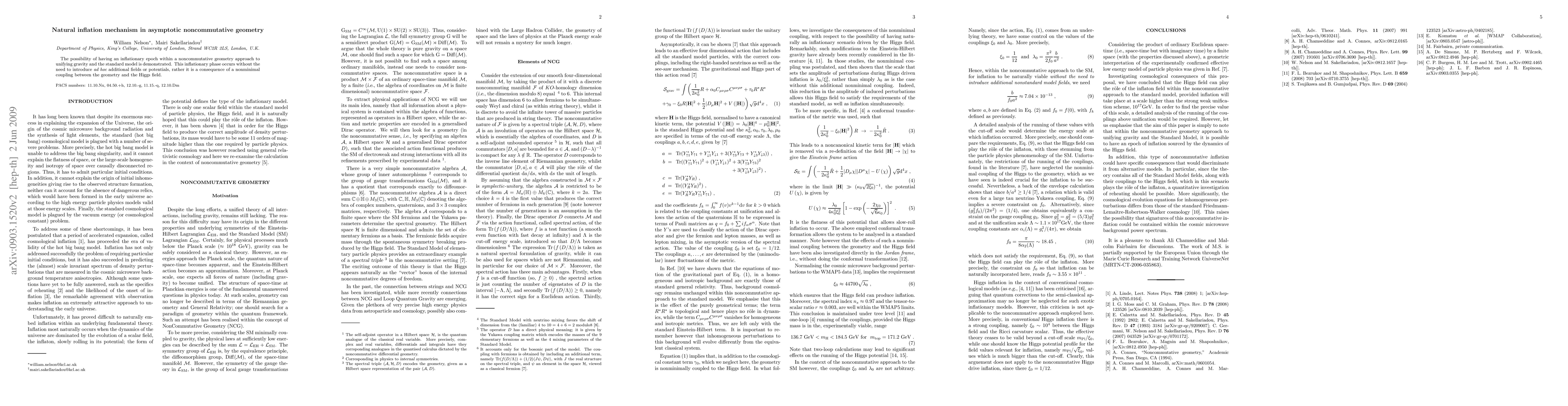 Summary: This paper explores natural inflation in the context of asymptotic noncommutative geometry, showing that inflation can arise from a nonminimal coupling between geometry and the Higgs field without requiring additional fields, thereby unifying gravity and the standard model.