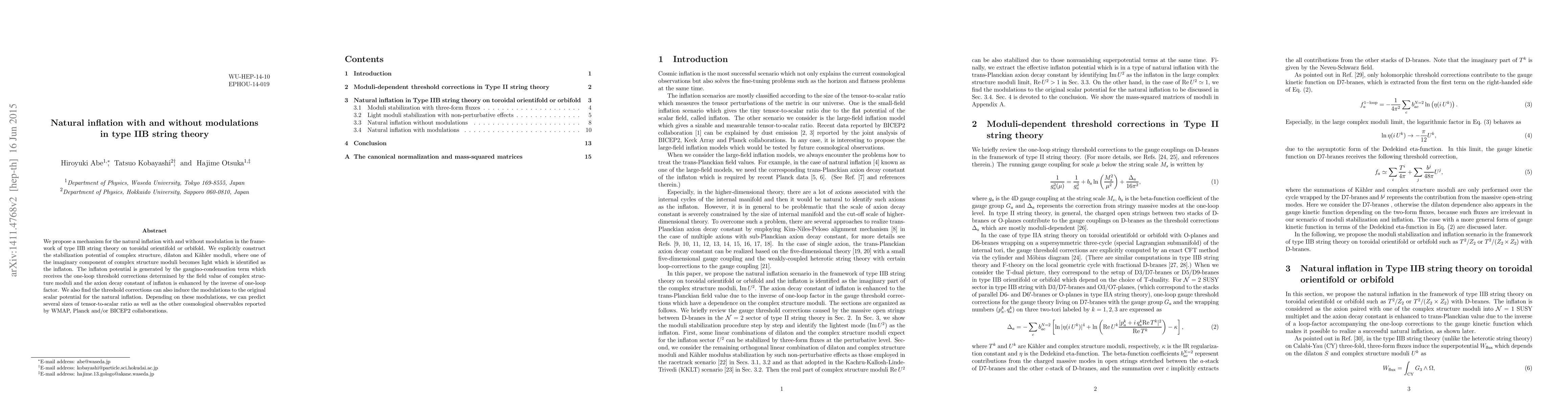 We propose a mechanism for the natural inflation with and without modulation in the framework of type IIB string theory on toroidal orientifold or orbifold. We explicitly construct the stabilization potential of complex structure, dilaton and K\"ahler moduli, where one of the imaginary component of complex structure moduli becomes light which is identified as the inflaton. The inflaton potential is generated by the gaugino-condensation term which receives the one-loop threshold corrections determined by the field value of complex structure moduli and the axion decay constant of inflaton is enhanced by the inverse of one-loop factor. We also find the threshold corrections can also induce the modulations to the original scalar potential for the natural inflation. Depending on these modulations, we can predict several sizes of tensor-to-scalar ratio as well as the other cosmological observables reported by WMAP, Planck and/or BICEP2 collaborations.