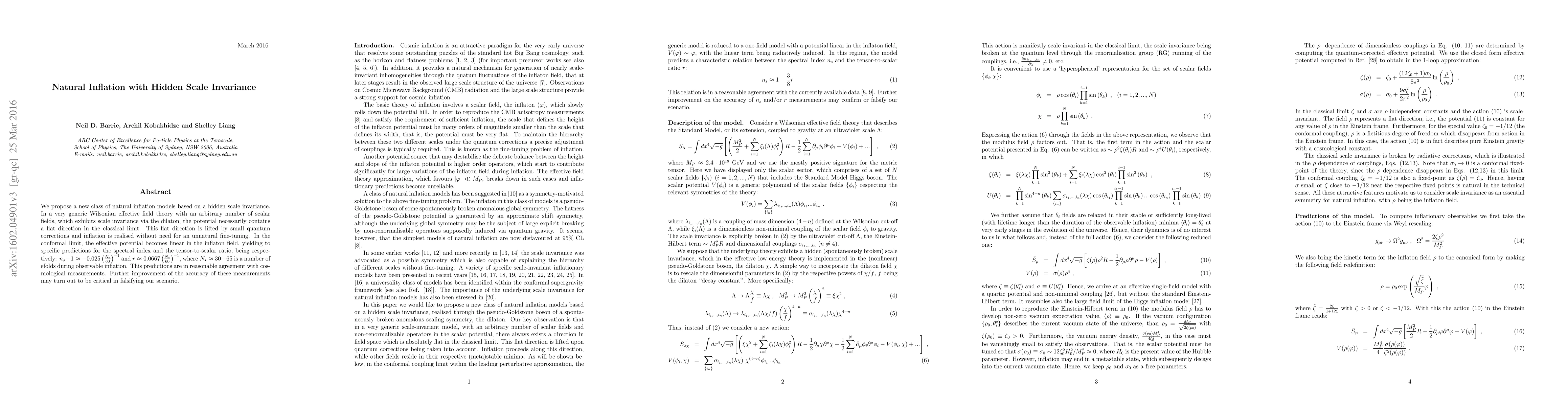 This paper proposes a new natural inflation model based on hidden scale invariance, where quantum corrections lift a classically flat direction without fine-tuning. Predictions for the spectral index and tensor-to-scalar ratio align with cosmological measurements, suggesting potential falsifiability with improved observational accuracy.