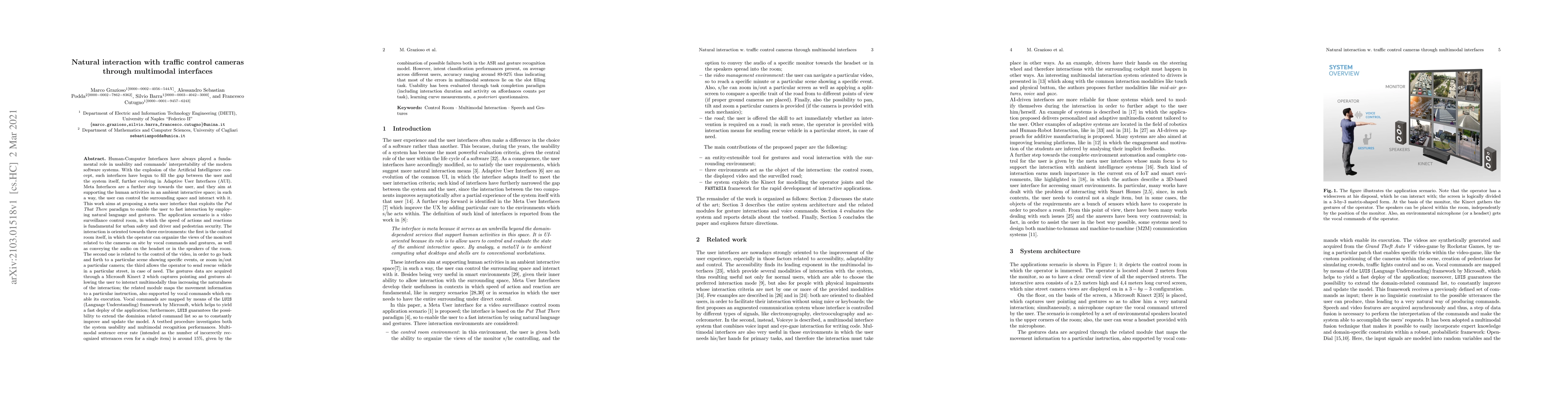 Human-Computer Interfaces have always played a fundamental role in usability and commands' interpretability of the modern software systems. With the explosion of the Artificial Intelligence concept, such interfaces have begun to fill the gap between the user and the system itself, further evolving in Adaptive User Interfaces (AUI). Meta Interfaces are a further step towards the user, and they aim at supporting the human activities in an ambient interactive space; in such a way, the user can control the surrounding space and interact with it. This work aims at proposing a meta user interface that exploits the Put That There paradigm to enable the user to fast interaction by employing natural language and gestures. The application scenario is a video surveillance control room, in which the speed of actions and reactions is fundamental for urban safety and driver and pedestrian security. The interaction is oriented towards three environments: the first is the control room itself, in which the operator can organize the views of the monitors related to the cameras on site by vocal commands and gestures, as well as conveying the audio on the headset or in the speakers of the room. The second one is related to the control of the video, in order to go back and forth to a particular scene showing specific events, or zoom in/out a particular camera; the third allows the operator to send rescue vehicle in a particular street, in case of need. The gestures data are acquired through a Microsoft Kinect 2 which captures pointing and gestures allowing the user to interact multimodally thus increasing the naturalness of the interaction; the related module maps the movement information to a particular instruction, also supported by vocal commands which enable its execution. (cont...)