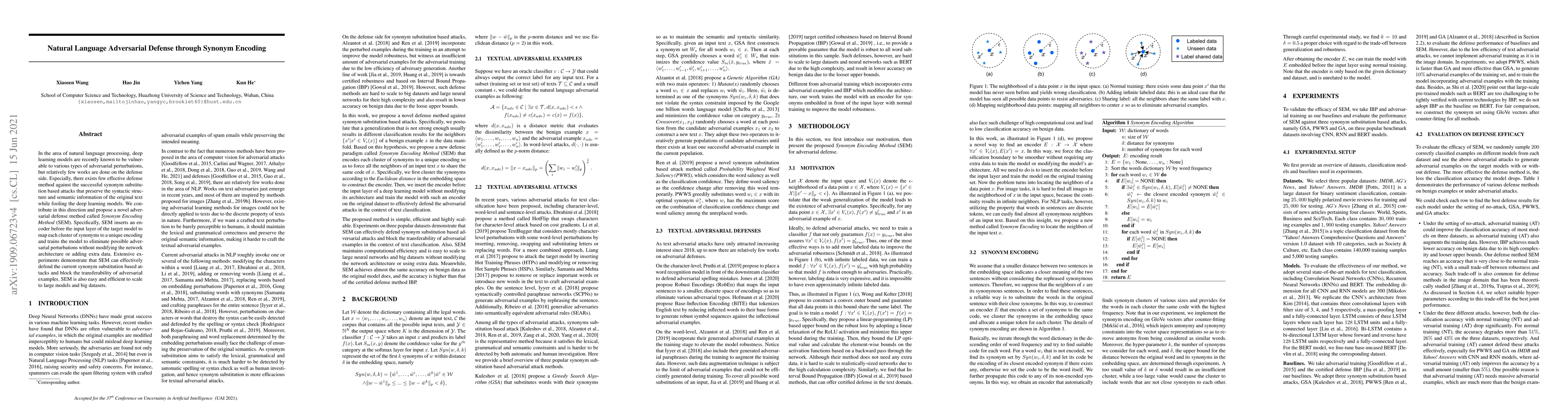 This paper proposes Synonym Encoding Method (SEM) to defend against synonym substitution attacks in natural language processing. SEM uses an encoder to map synonym clusters to unique encodings, effectively blocking adversarial examples without altering the network architecture or requiring extra data.
