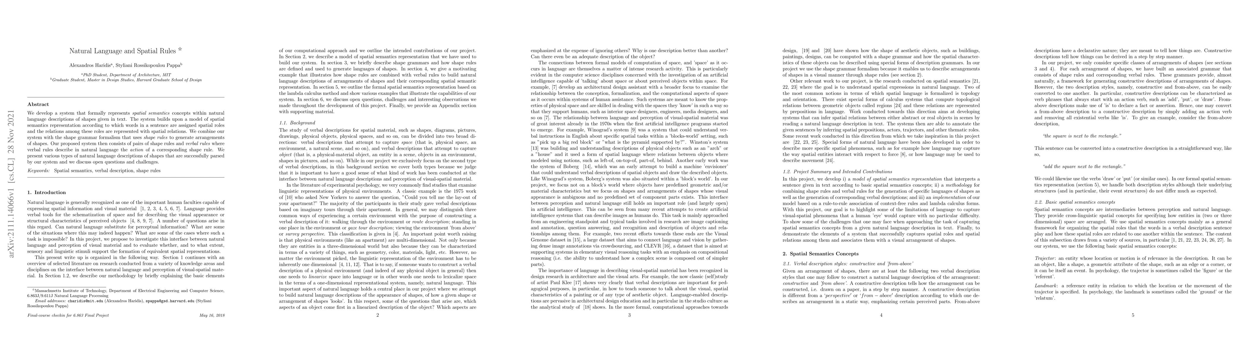 We develop a system that formally represents spatial semantics concepts within natural language descriptions of spatial arrangements. The system builds on a model of spatial semantics representation according to which words in a sentence are assigned spatial roles and the relations among these roles are represented with spatial relations. We combine our system with the shape grammar formalism that uses shape rules to generate languages (sets) of two-dimensional shapes. Our proposed system consists of pairs of shape rules and verbal rules where the verbal rules describe in English the action of the associated shape rule. We present various types of natural language descriptions of shapes that are successfully parsed by our system and we discuss open questions and challenges we see at the interface of language and perception.