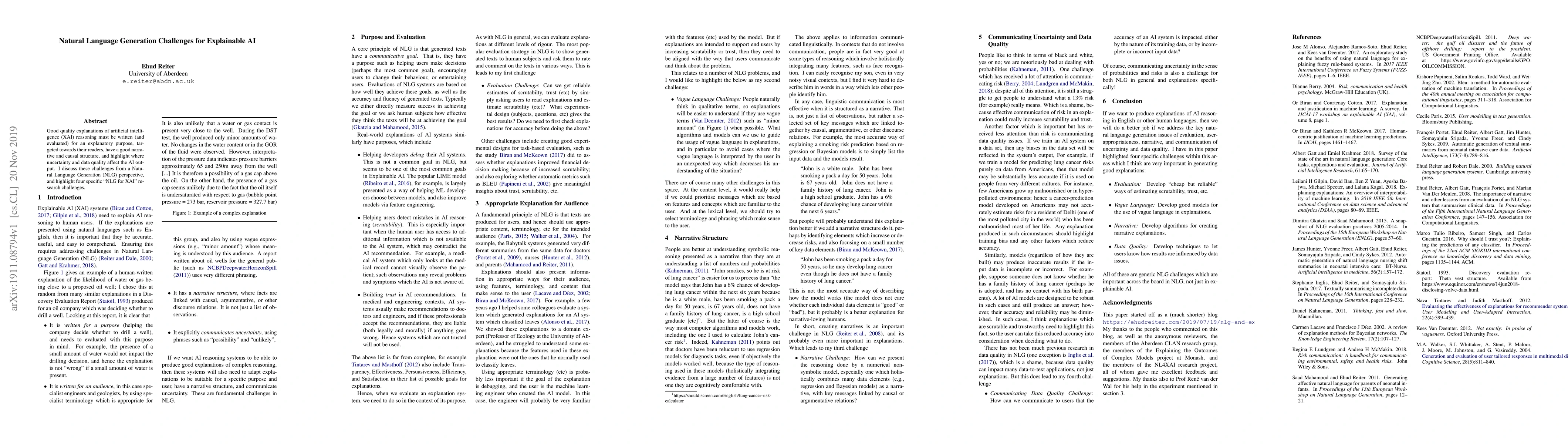 Good quality explanations of artificial intelligence (XAI) reasoning must be written (and evaluated) for an explanatory purpose, targeted towards their readers, have a good narrative and causal structure, and highlight where uncertainty and data quality affect the AI output. I discuss these challenges from a Natural Language Generation (NLG) perspective, and highlight four specific NLG for XAI research challenges.
