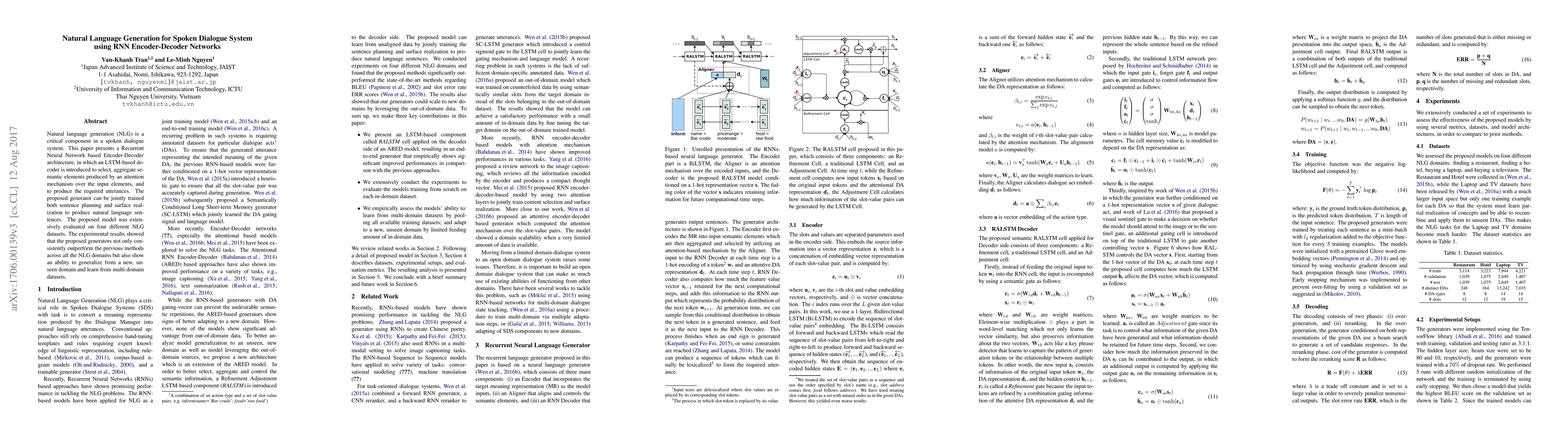 This paper proposes an RNN-based Encoder-Decoder model for natural language generation in spoken dialogue systems, utilizing an LSTM-based decoder with attention mechanism. The model outperforms previous methods across various datasets and demonstrates generalization capabilities.