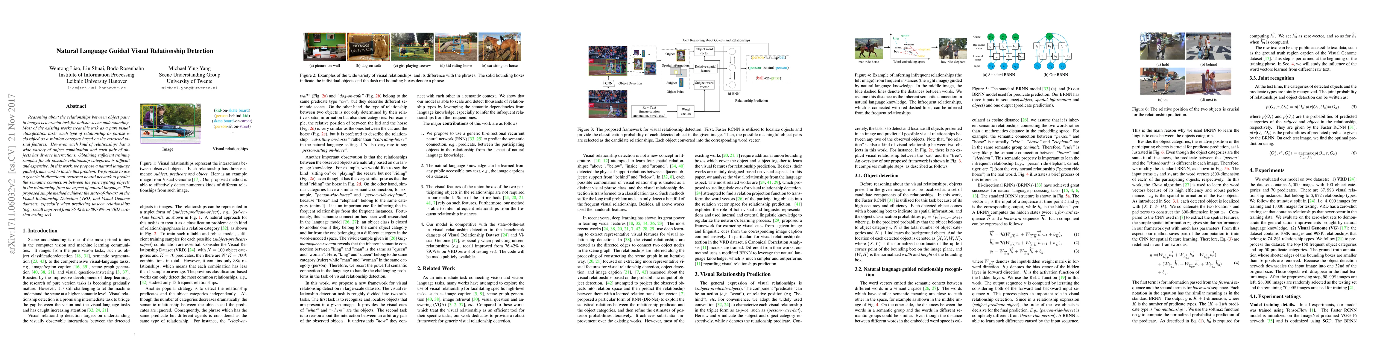 This paper introduces a natural language guided framework for visual relationship detection, addressing the challenge of diverse object interactions and relationship categories. The proposed method uses a bi-directional recurrent neural network to predict semantic connections based on natural language, achieving state-of-the-art results and significantly improving zero-shot recall on the VRD and Visual Genome datasets.