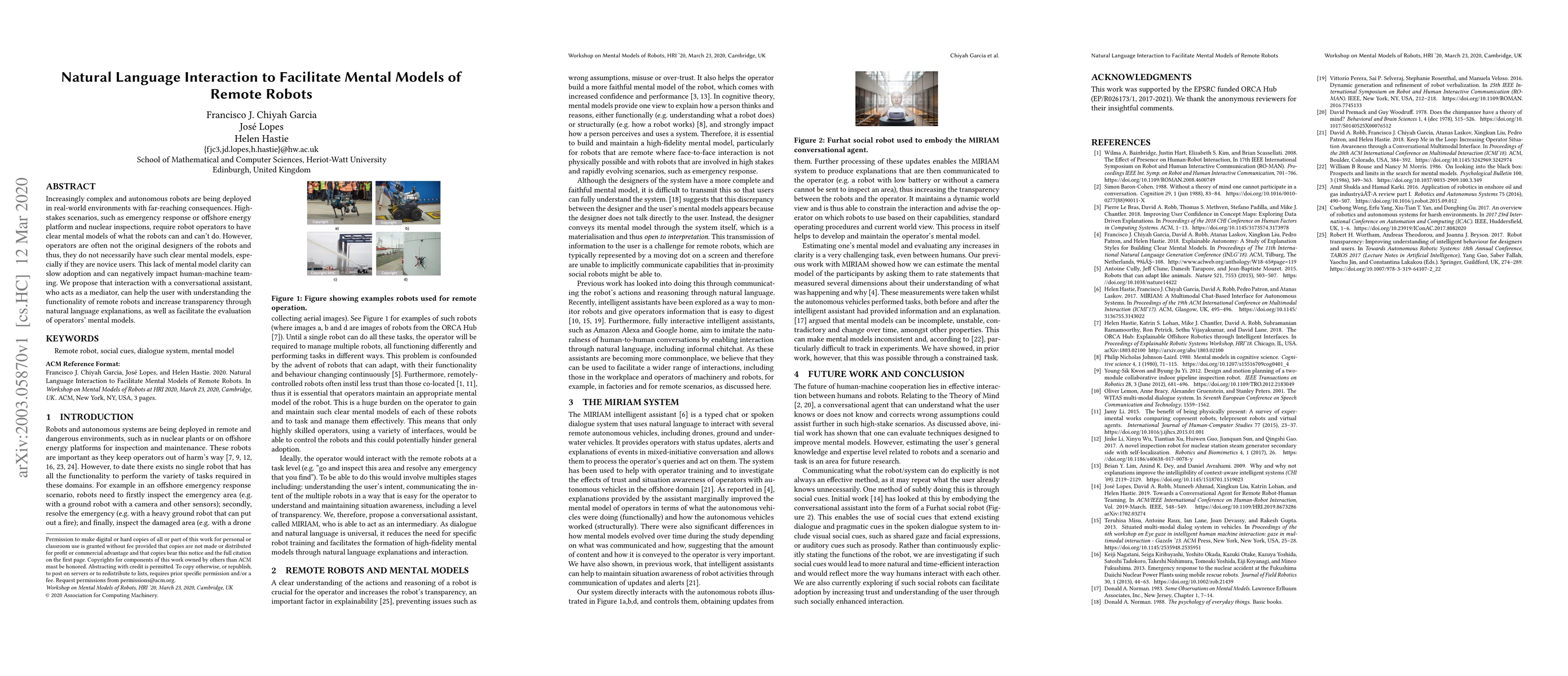 Increasingly complex and autonomous robots are being deployed in real-world environments with far-reaching consequences. High-stakes scenarios, such as emergency response or offshore energy platform and nuclear inspections, require robot operators to have clear mental models of what the robots can and can't do. However, operators are often not the original designers of the robots and thus, they do not necessarily have such clear mental models, especially if they are novice users. This lack of mental model clarity can slow adoption and can negatively impact human-machine teaming. We propose that interaction with a conversational assistant, who acts as a mediator, can help the user with understanding the functionality of remote robots and increase transparency through natural language explanations, as well as facilitate the evaluation of operators' mental models.