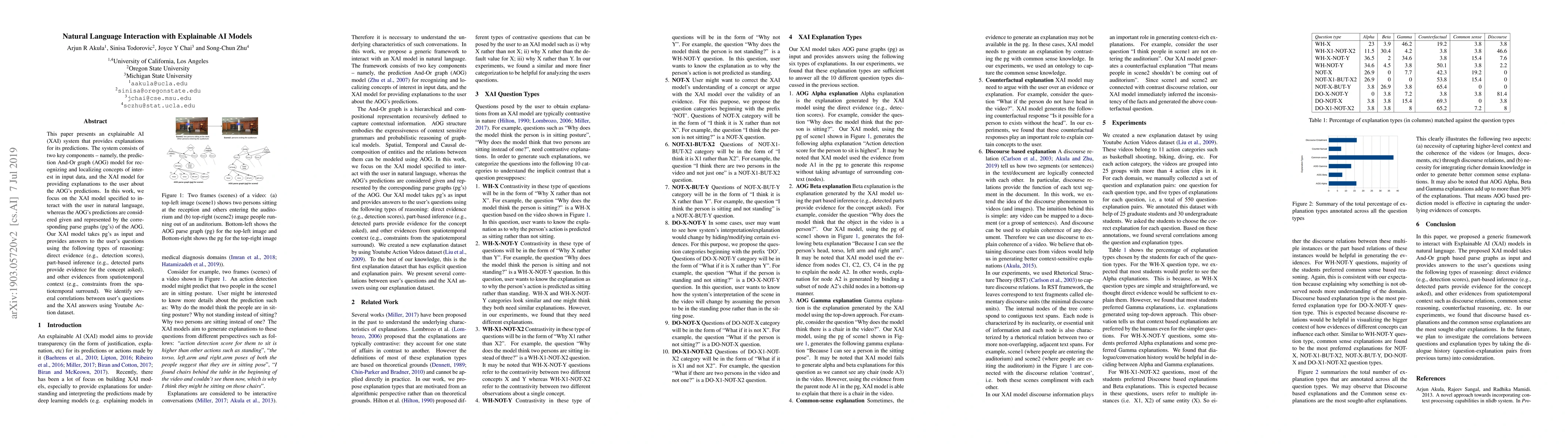This paper presents an explainable AI (XAI) system that provides explanations for its predictions. The system consists of two key components -- namely, the prediction And-Or graph (AOG) model for recognizing and localizing concepts of interest in input data, and the XAI model for providing explanations to the user about the AOG's predictions. In this work, we focus on the XAI model specified to interact with the user in natural language, whereas the AOG's predictions are considered given and represented by the corresponding parse graphs (pg's) of the AOG. Our XAI model takes pg's as input and provides answers to the user's questions using the following types of reasoning: direct evidence (e.g., detection scores), part-based inference (e.g., detected parts provide evidence for the concept asked), and other evidences from spatio-temporal context (e.g., constraints from the spatio-temporal surround). We identify several correlations between user's questions and the XAI answers using Youtube Action dataset.