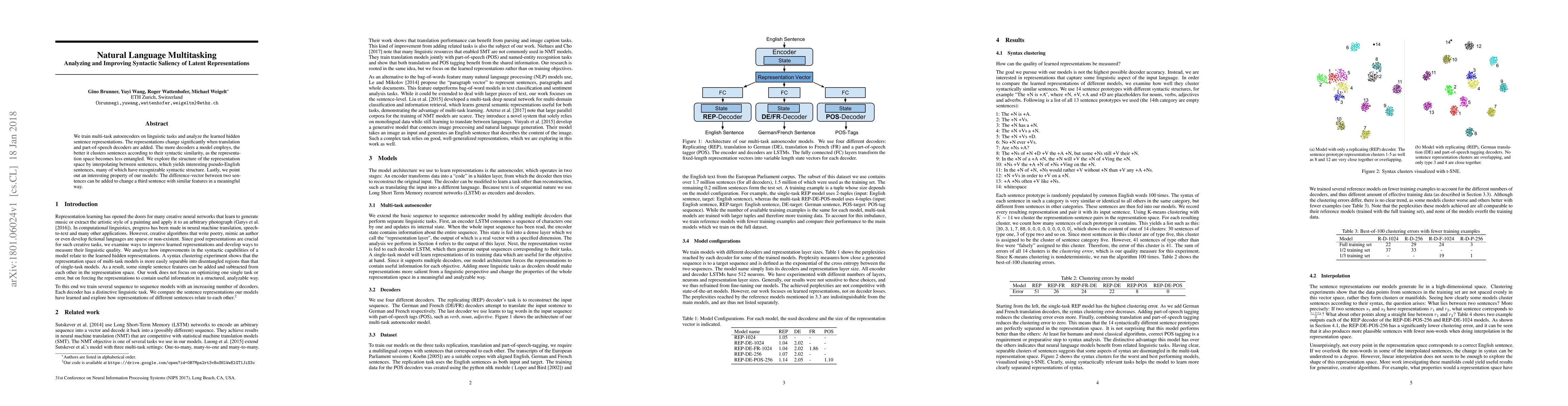 We train multi-task autoencoders on linguistic tasks and analyze the learned hidden sentence representations. The representations change significantly when translation and part-of-speech decoders are added. The more decoders a model employs, the better it clusters sentences according to their syntactic similarity, as the representation space becomes less entangled. We explore the structure of the representation space by interpolating between sentences, which yields interesting pseudo-English sentences, many of which have recognizable syntactic structure. Lastly, we point out an interesting property of our models: The difference-vector between two sentences can be added to change a third sentence with similar features in a meaningful way.