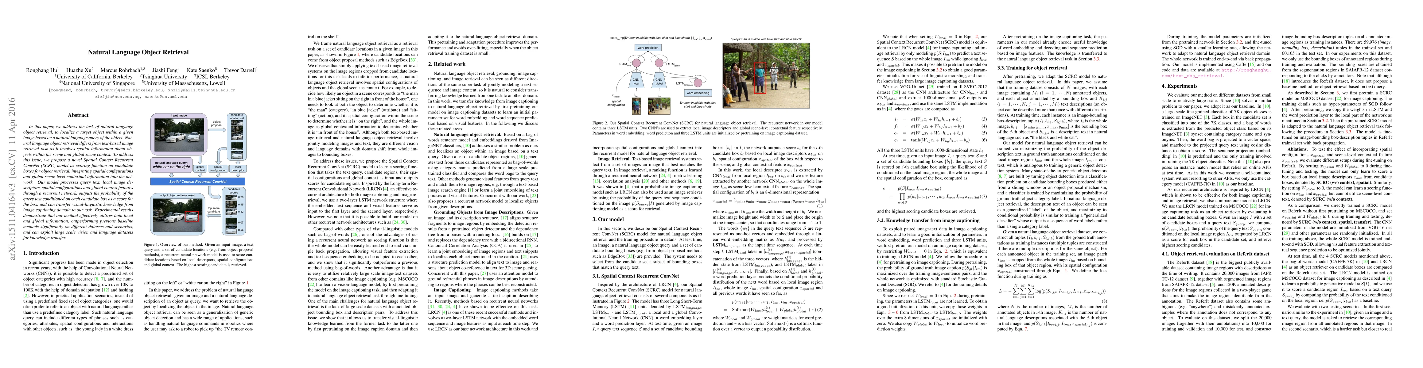 This paper proposes a Spatial Context Recurrent ConvNet (SCRC) model for natural language object retrieval, integrating spatial configurations and global scene context to localize objects within images based on natural language queries. The model outperforms previous methods by effectively utilizing both local and global information, leveraging knowledge transfer from image captioning.