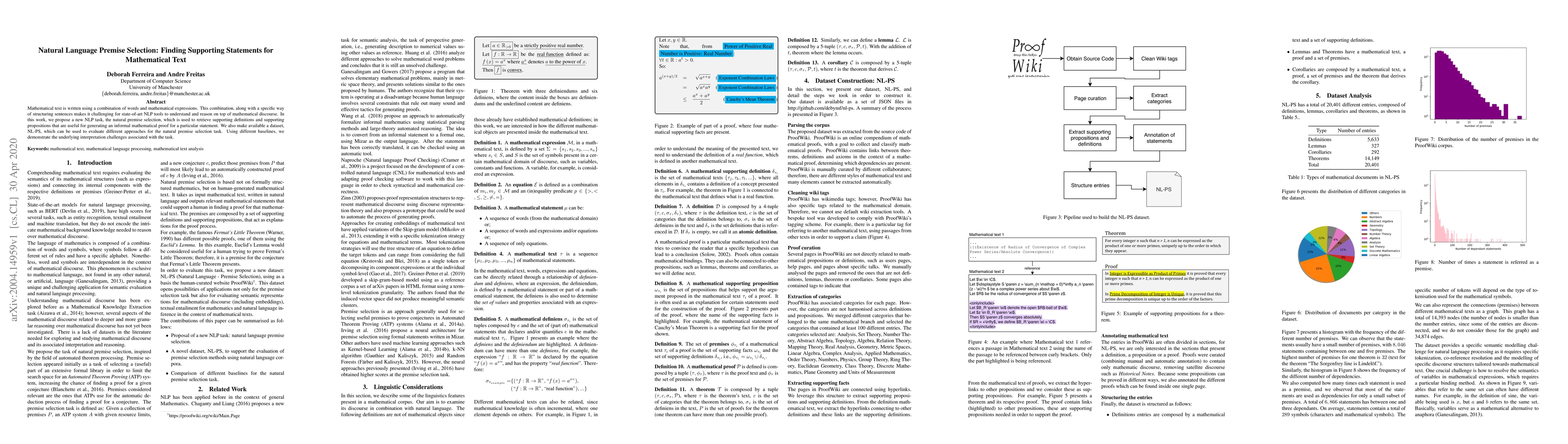Mathematical text is written using a combination of words and mathematical expressions. This combination, along with a specific way of structuring sentences makes it challenging for state-of-art NLP tools to understand and reason on top of mathematical discourse. In this work, we propose a new NLP task, the natural premise selection, which is used to retrieve supporting definitions and supporting propositions that are useful for generating an informal mathematical proof for a particular statement. We also make available a dataset, NL-PS, which can be used to evaluate different approaches for the natural premise selection task. Using different baselines, we demonstrate the underlying interpretation challenges associated with the task.