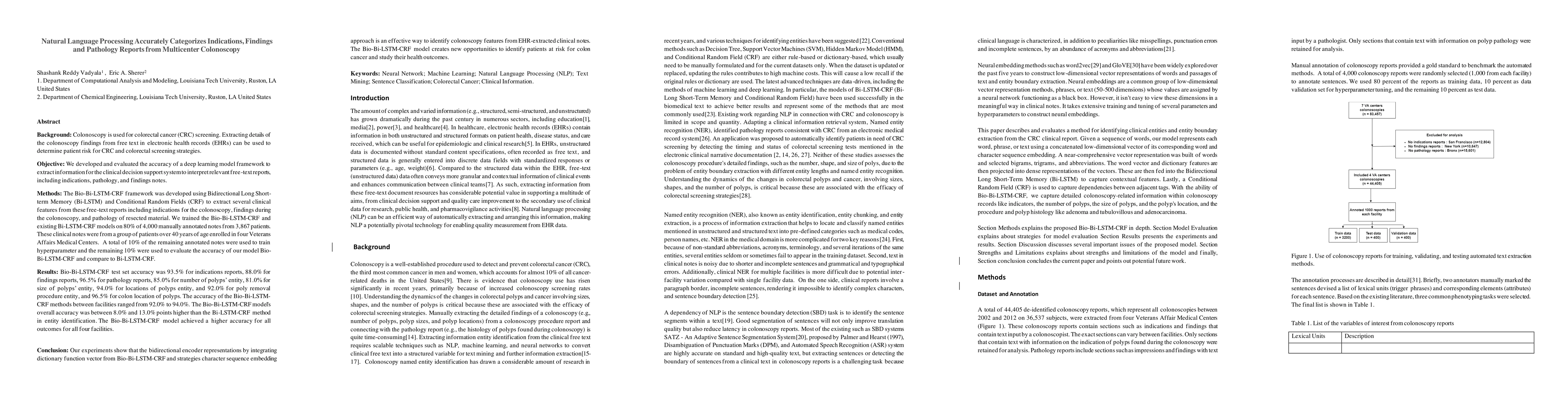 This paper presents a deep learning model framework, Bio-Bi-LSTM-CRF, to accurately categorize indications, findings, and pathology from colonoscopy reports. The model was trained on 4,000 annotated notes from four Veterans Affairs Medical Centers and demonstrated improved accuracy compared to existing Bi-LSTM-CRF models.
