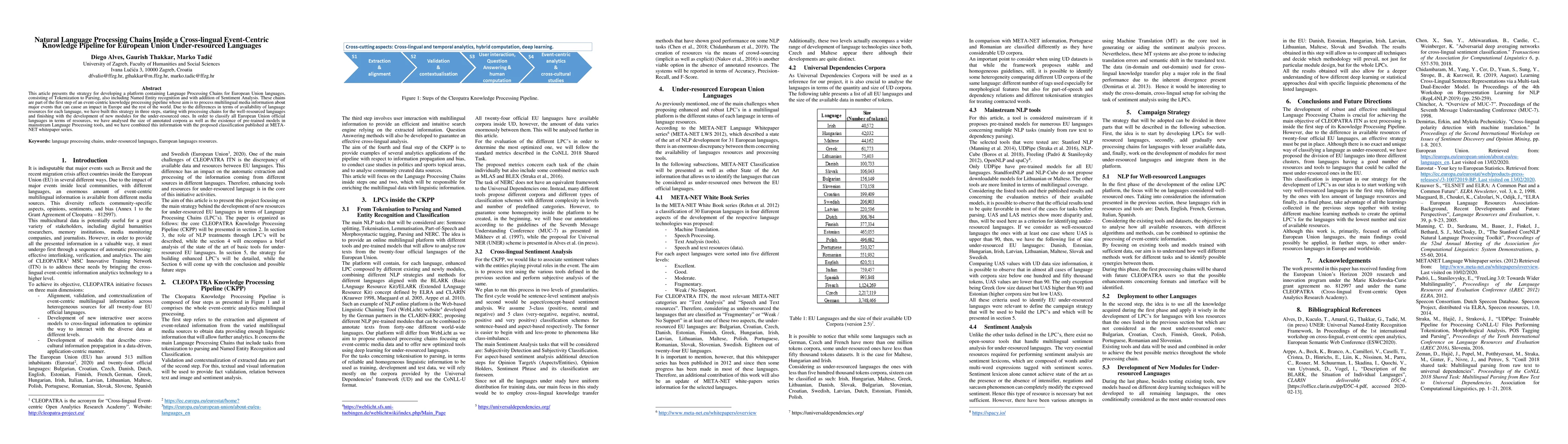 This paper outlines a strategy for creating a multilingual NLP platform for European Union languages, focusing on under-resourced languages. It details the development of language processing chains, including tokenization, parsing, named entity recognition, and sentiment analysis, as part of an event-centric knowledge pipeline for impactful global events.