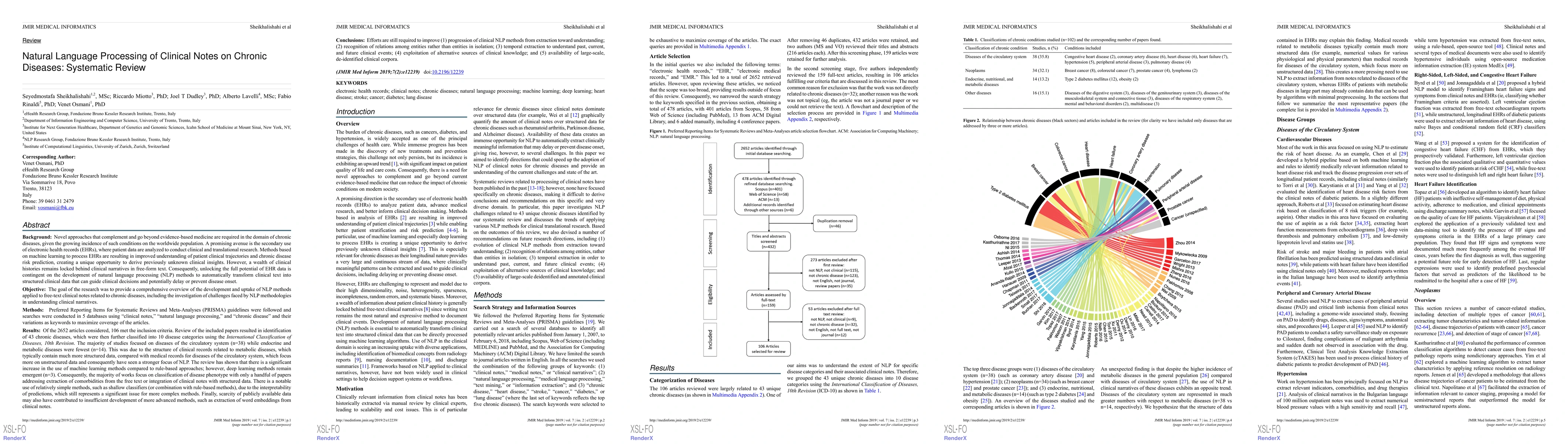 Of the 2652 articles considered, 106 met the inclusion criteria. Review of the included papers resulted in identification of 43 chronic diseases, which were then further classified into 10 disease categories using ICD-10. The majority of studies focused on diseases of the circulatory system (n=38) while endocrine and metabolic diseases were fewest (n=14). This was due to the structure of clinical records related to metabolic diseases, which typically contain much more structured data, compared with medical records for diseases of the circulatory system, which focus more on unstructured data and consequently have seen a stronger focus of NLP. The review has shown that there is a significant increase in the use of machine learning methods compared to rule-based approaches; however, deep learning methods remain emergent (n=3). Consequently, the majority of works focus on classification of disease phenotype with only a handful of papers addressing extraction of comorbidities from the free text or integration of clinical notes with structured data. There is a notable use of relatively simple methods, such as shallow classifiers (or combination with rule-based methods), due to the interpretability of predictions, which still represents a significant issue for more complex methods. Finally, scarcity of publicly available data may also have contributed to insufficient development of more advanced methods, such as extraction of word embeddings from clinical notes. Further efforts are still required to improve (1) progression of clinical NLP methods from extraction toward understanding; (2) recognition of relations among entities rather than entities in isolation; (3) temporal extraction to understand past, current, and future clinical events; (4) exploitation of alternative sources of clinical knowledge; and (5) availability of large-scale, de-identified clinical corpora.
