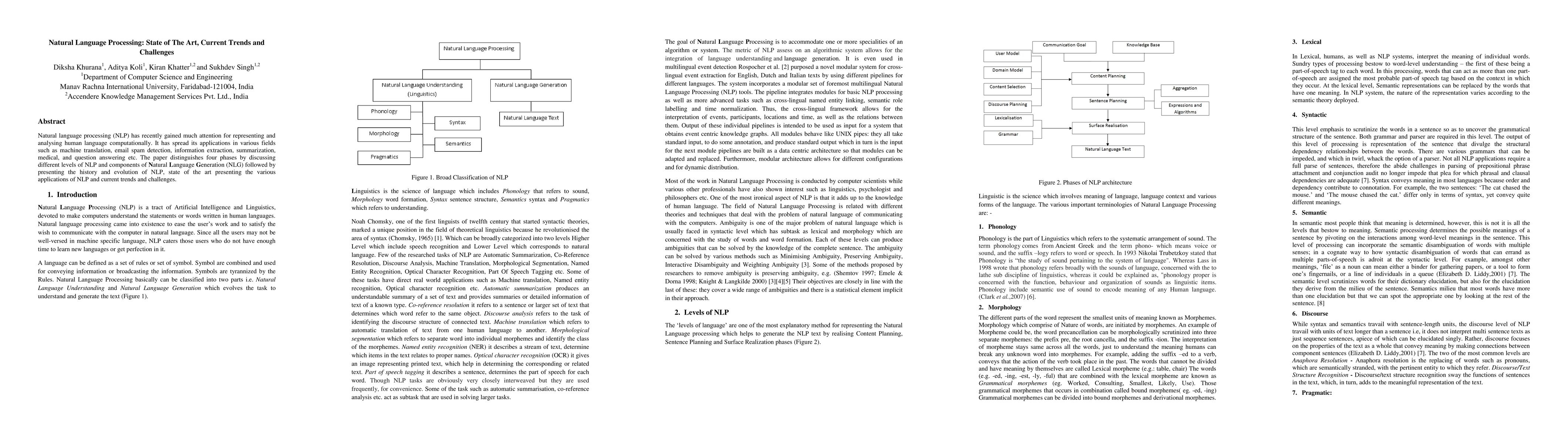 Natural language processing (NLP) has recently gained much attention for representing and analysing human language computationally. It has spread its applications in various fields such as machine translation, email spam detection, information extraction, summarization, medical, and question answering etc. The paper distinguishes four phases by discussing different levels of NLP and components of Natural Language Generation (NLG) followed by presenting the history and evolution of NLP, state of the art presenting the various applications of NLP and current trends and challenges.