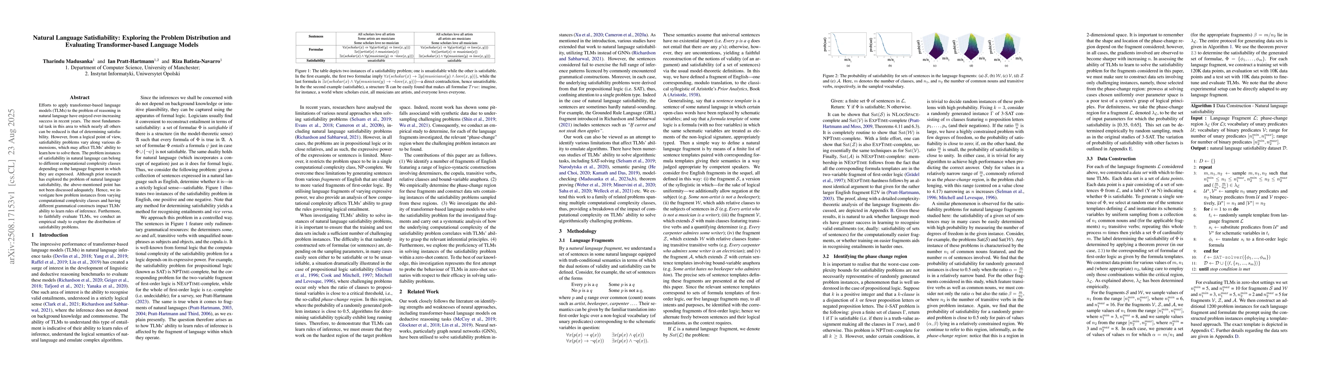 Efforts to apply transformer-based language models (TLMs) to the problem of reasoning in natural language have enjoyed ever-increasing success in recent years. The most fundamental task in this area to which nearly all others can be reduced is that of determining satisfiability. However, from a logical point of view, satisfiability problems vary along various dimensions, which may affect TLMs' ability to learn how to solve them. The problem instances of satisfiability in natural language can belong to different computational complexity classes depending on the language fragment in which they are expressed. Although prior research has explored the problem of natural language satisfiability, the above-mentioned point has not been discussed adequately. Hence, we investigate how problem instances from varying computational complexity classes and having different grammatical constructs impact TLMs' ability to learn rules of inference. Furthermore, to faithfully evaluate TLMs, we conduct an empirical study to explore the distribution of satisfiability problems.