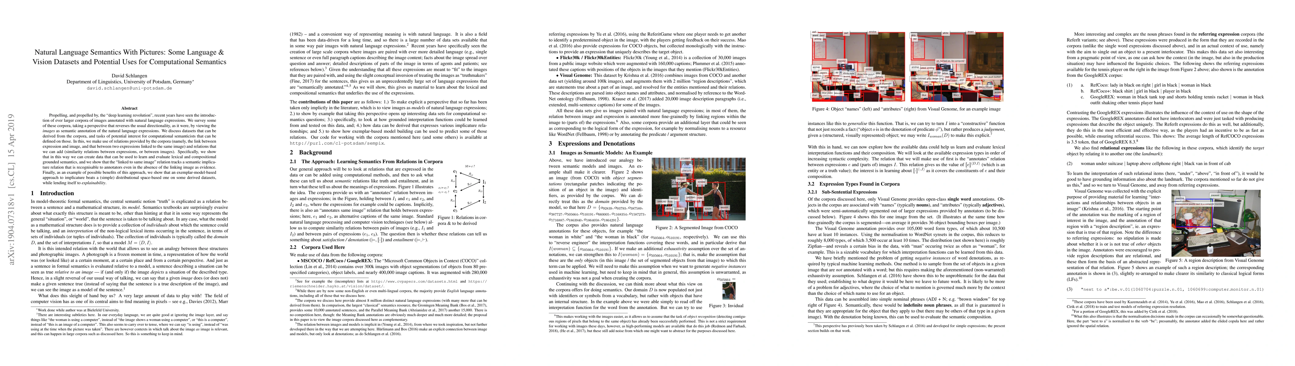 Propelling, and propelled by, the "deep learning revolution", recent years have seen the introduction of ever larger corpora of images annotated with natural language expressions. We survey some of these corpora, taking a perspective that reverses the usual directionality, as it were, by viewing the images as semantic annotation of the natural language expressions. We discuss datasets that can be derived from the corpora, and tasks of potential interest for computational semanticists that can be defined on those. In this, we make use of relations provided by the corpora (namely, the link between expression and image, and that between two expressions linked to the same image) and relations that we can add (similarity relations between expressions, or between images). Specifically, we show that in this way we can create data that can be used to learn and evaluate lexical and compositional grounded semantics, and we show that the "linked to same image" relation tracks a semantic implication relation that is recognisable to annotators even in the absence of the linking image as evidence. Finally, as an example of possible benefits of this approach, we show that an exemplar-model-based approach to implication beats a (simple) distributional space-based one on some derived datasets, while lending itself to explainability.