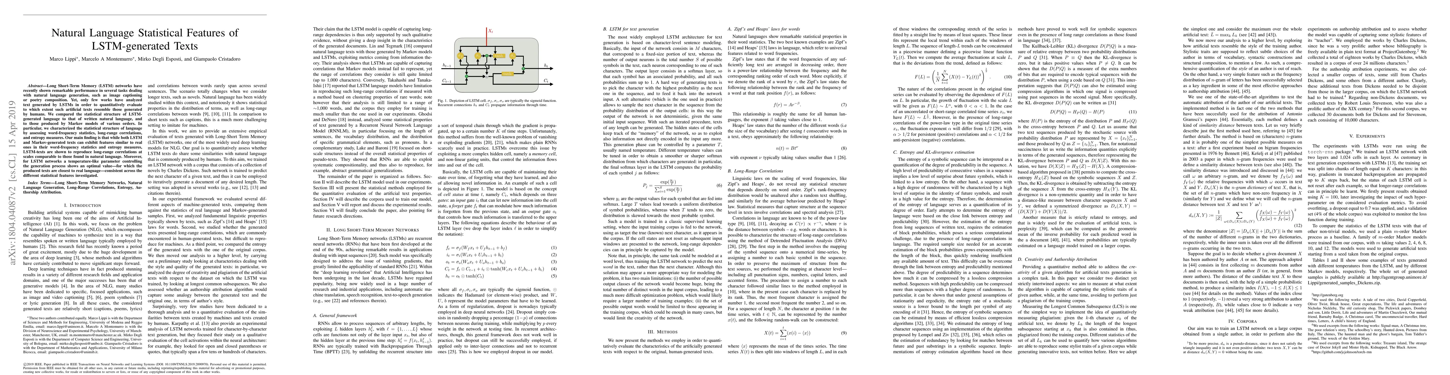This paper evaluates the statistical features of texts generated by LSTM networks compared to natural language and Markov models, finding that LSTMs better reproduce long-range correlations, while both LSTM and Markov models show similar word-frequency statistics and entropy measures. An optimal temperature parameter for LSTMs yields texts most resembling real language.