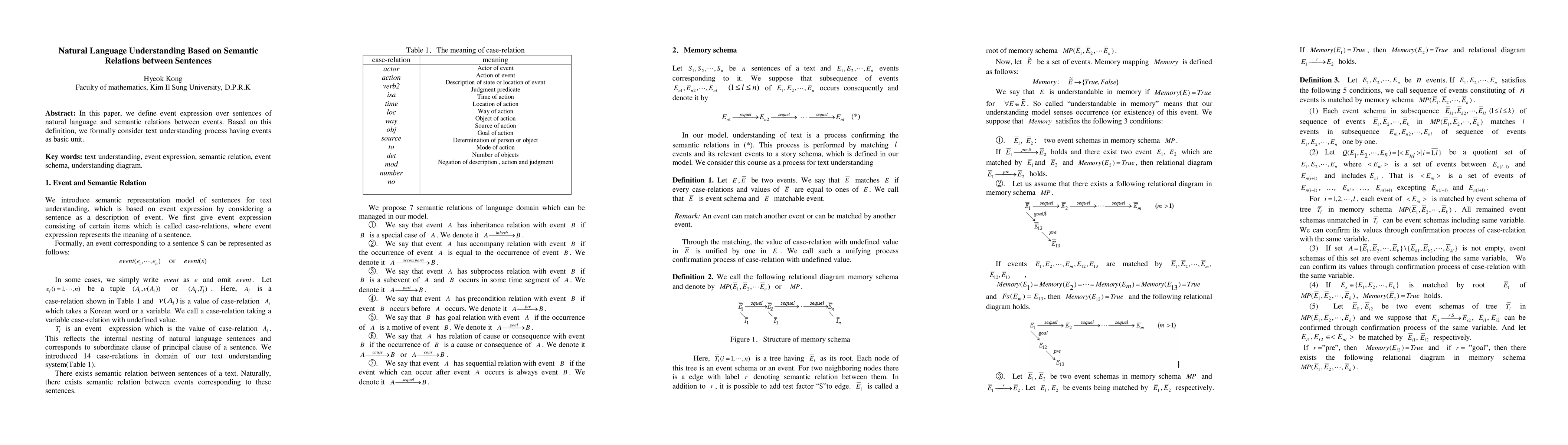 In this paper, we define event expression over sentences of natural language and semantic relations between events. Based on this definition, we formally consider text understanding process having events as basic unit.