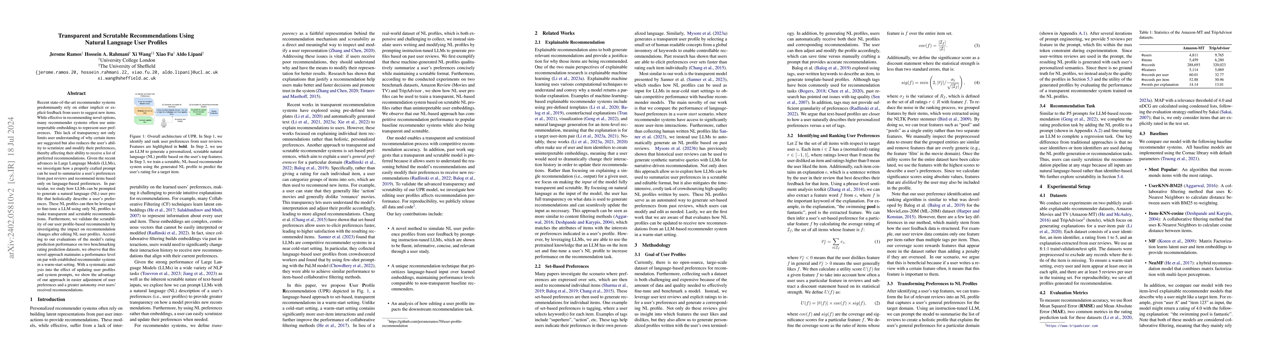 This paper introduces a method to create transparent and interpretable natural language user profiles that describe user preferences based on reviews, thereby providing understandable and editable recommendations compared to traditional uninterpretable recommender systems. The approach maintains competitive recommendation performance while enhancing user control and transparency.
