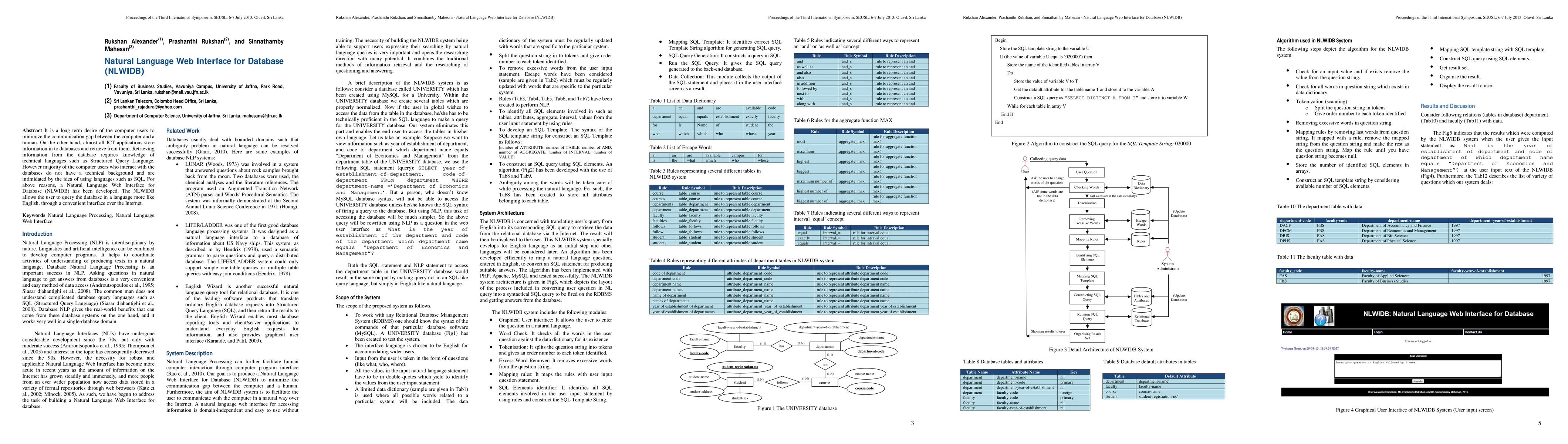 It is a long term desire of the computer users to minimize the communication gap between the computer and a human. On the other hand, almost all ICT applications store information in to databases and retrieve from them. Retrieving information from the database requires knowledge of technical languages such as Structured Query Language. However majority of the computer users who interact with the databases do not have a technical background and are intimidated by the idea of using languages such as SQL. For above reasons, a Natural Language Web Interface for Database (NLWIDB) has been developed. The NLWIDB allows the user to query the database in a language more like English, through a convenient interface over the Internet.