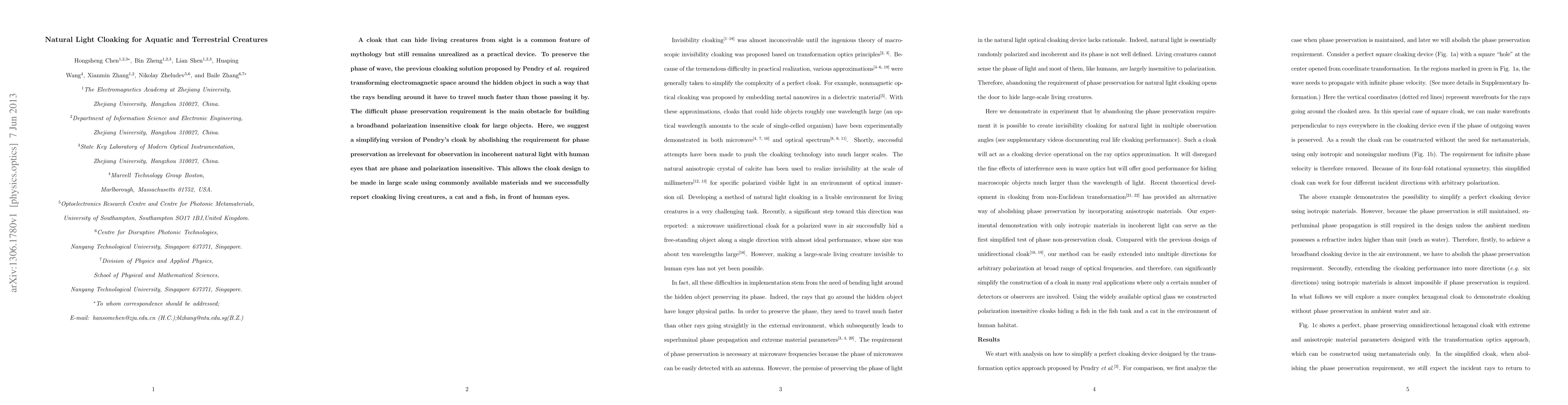 This paper proposes a simplified cloaking method for hiding living creatures from natural light, eliminating the need for phase preservation, which allows for the use of common materials and successful cloaking of animals like a cat and a fish. This approach makes the cloak practical and scalable for real-world applications.