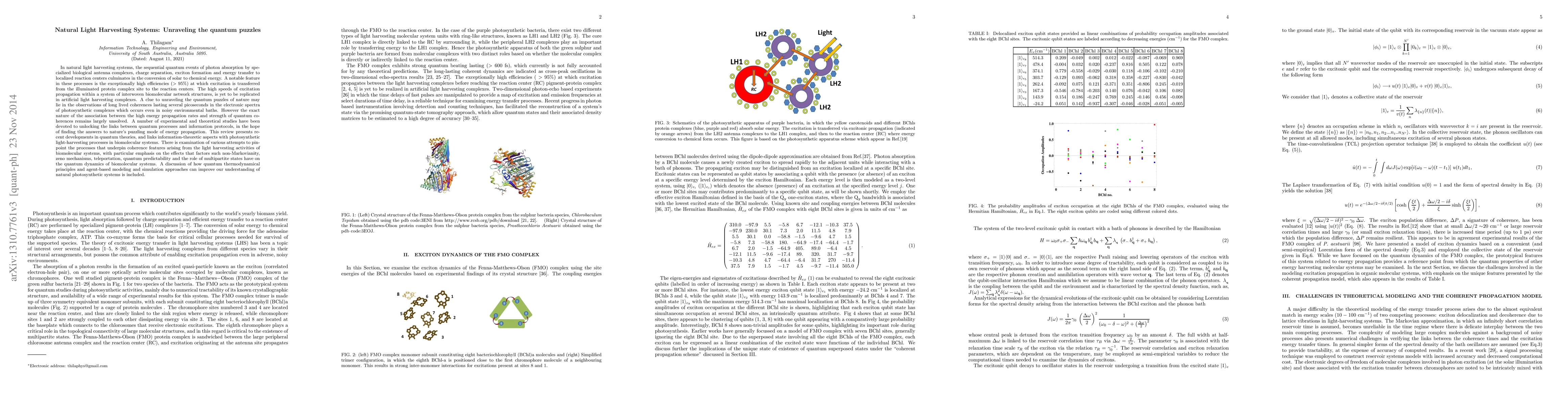 This paper reviews the quantum mechanisms underlying natural light-harvesting systems, focusing on the high efficiency of energy transfer and the role of quantum coherences. It explores how quantum dynamics, non-Markovianity, and thermodynamic principles can enhance our understanding of these biological processes.