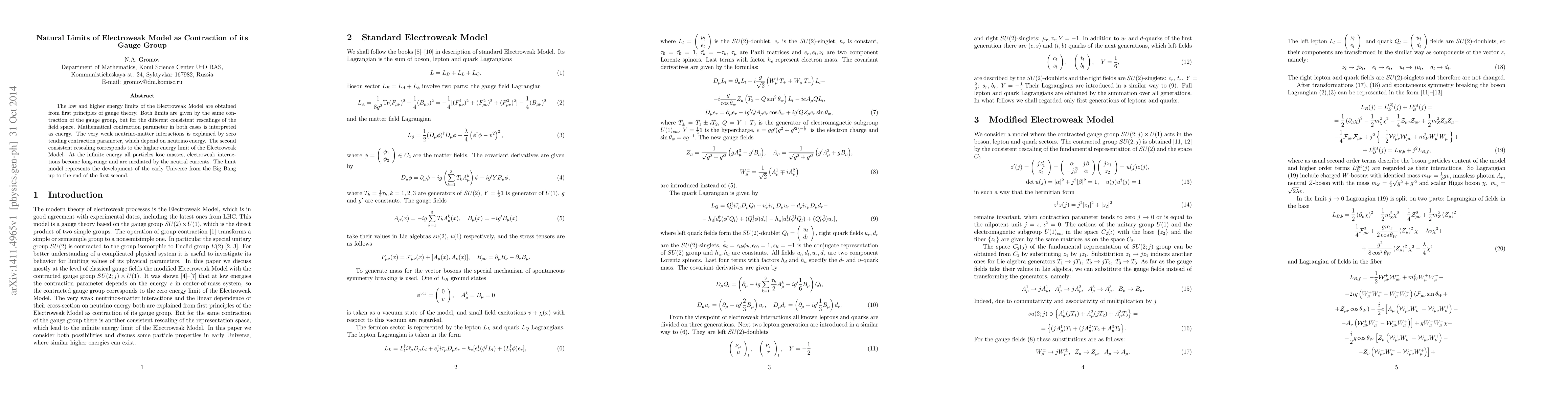 The low and higher energy limits of the Electroweak Model are obtained from first principles of gauge theory. Both limits are given by the same contraction of the gauge group, but for the different consistent rescalings of the field space. Mathematical contraction parameter in both cases is interpreted as energy. The very weak neutrino-matter interactions is explained by zero tending contraction parameter, which depend on neutrino energy. The second consistent rescaling corresponds to the higher energy limit of the Electroweak Model. At the infinite energy all particles lose masses, electroweak interactions become long-range and are mediated by the neutral currents. The limit model represents the development of the early Universe from the Big Bang up to the end of the first second.
