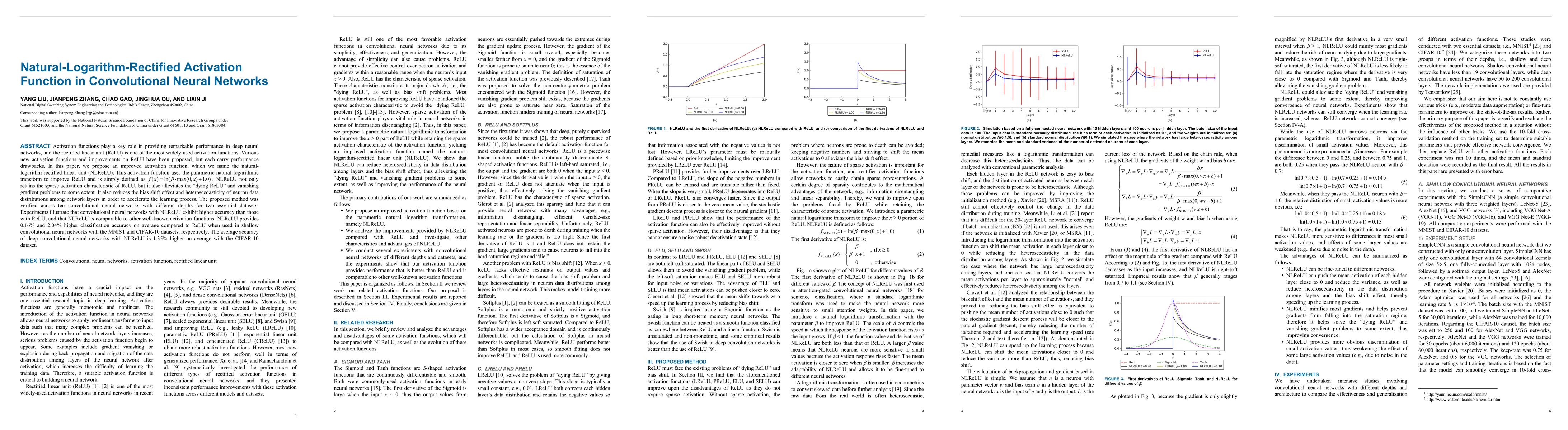 This paper proposes the natural-logarithm-rectified linear unit (NLReLU) as an improved activation function for convolutional neural networks, which enhances ReLU by addressing issues like "dying ReLU" and gradient vanishing. Experiments show that NLReLU achieves higher accuracy compared to ReLU, especially in shallow networks, with notable improvements on MNIST and CIFAR-10 datasets.