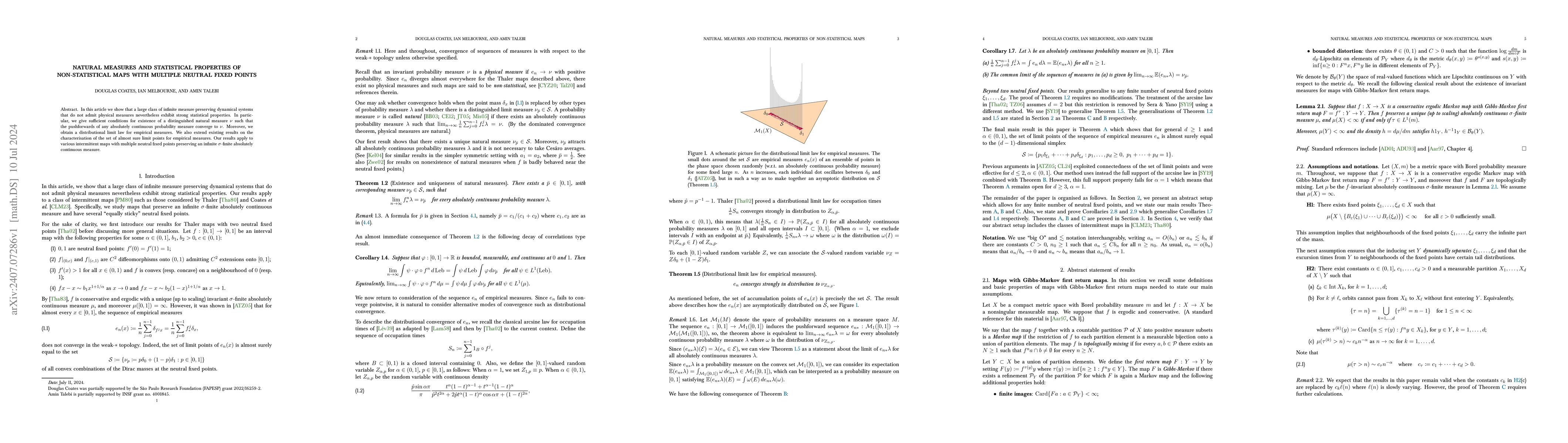 In this article we show that a large class of infinite measure preserving dynamical systems that do not admit physical measures nevertheless exhibit strong statistical properties. In particular, we give sufficient conditions for existence of a distinguished natural measure $\nu$ such that the pushforwards of any absolutely continuous probability measure converge to $\nu$. Moreover, we obtain a distributional limit law for empirical measures. We also extend existing results on the characterisation of the set of almost sure limit points for empirical measures. Our results apply to various intermittent maps with multiple neutral fixed points preserving an infinite $\sigma$-finite absolutely continuous measure.