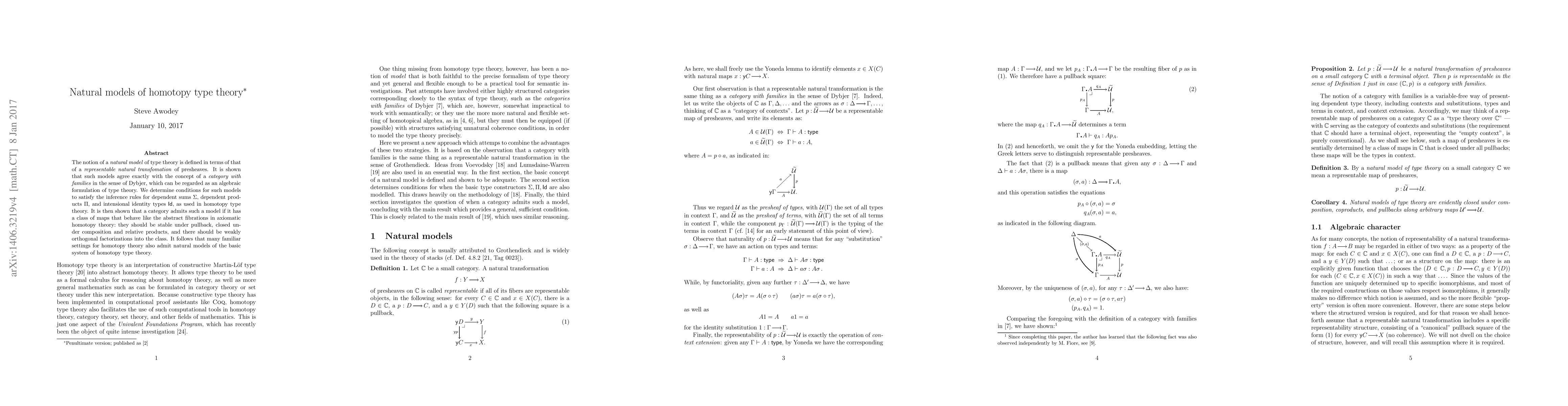 The paper defines natural models of homotopy type theory in terms of representable natural transformations of presheaves, aligning with categories having families (Dybjer's formulation). It establishes conditions for these models to satisfy inference rules for dependent sums, dependent products, and identity types.