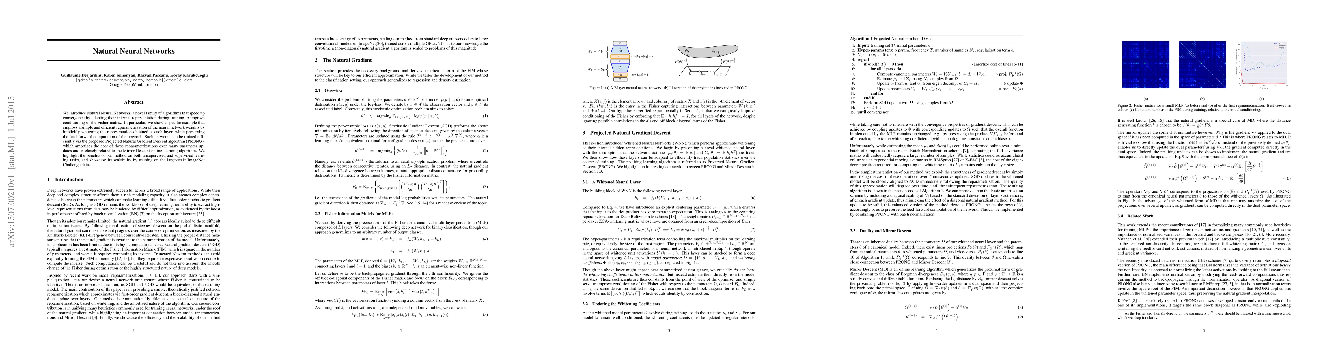 This paper introduces Natural Neural Networks, which accelerate convergence by adapting their internal representation to improve Fisher matrix conditioning. The method employs a reparametrization technique that implicitly whitens layer representations, enabling efficient training via the Projected Natural Gradient Descent algorithm, which scales well to large datasets like ImageNet.